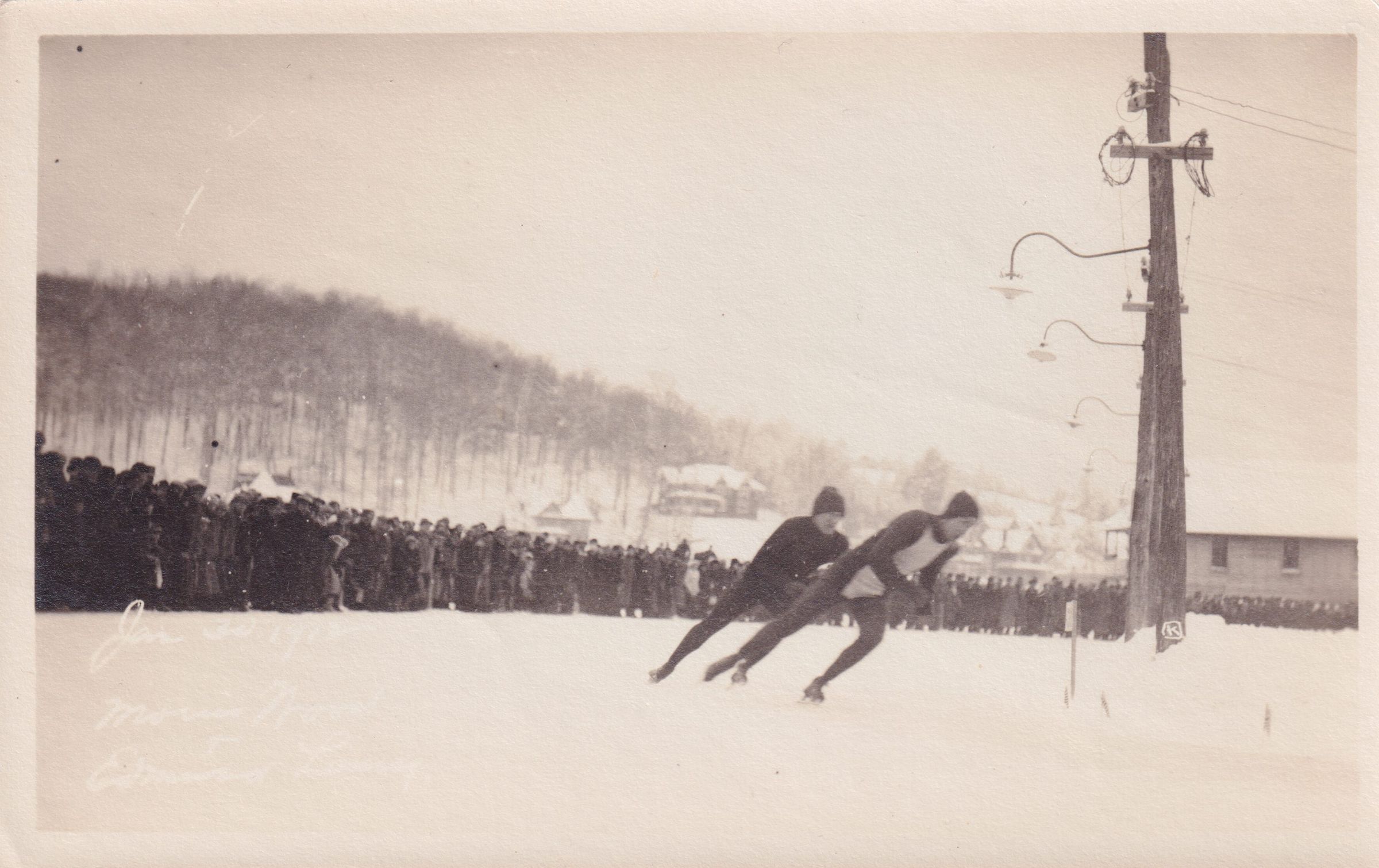 Photograph of two speed skaters racing along the track on Pontiac Bay on Lake Flower. The man at left is likely Ed Lamy. Spectators can be seen behind them.