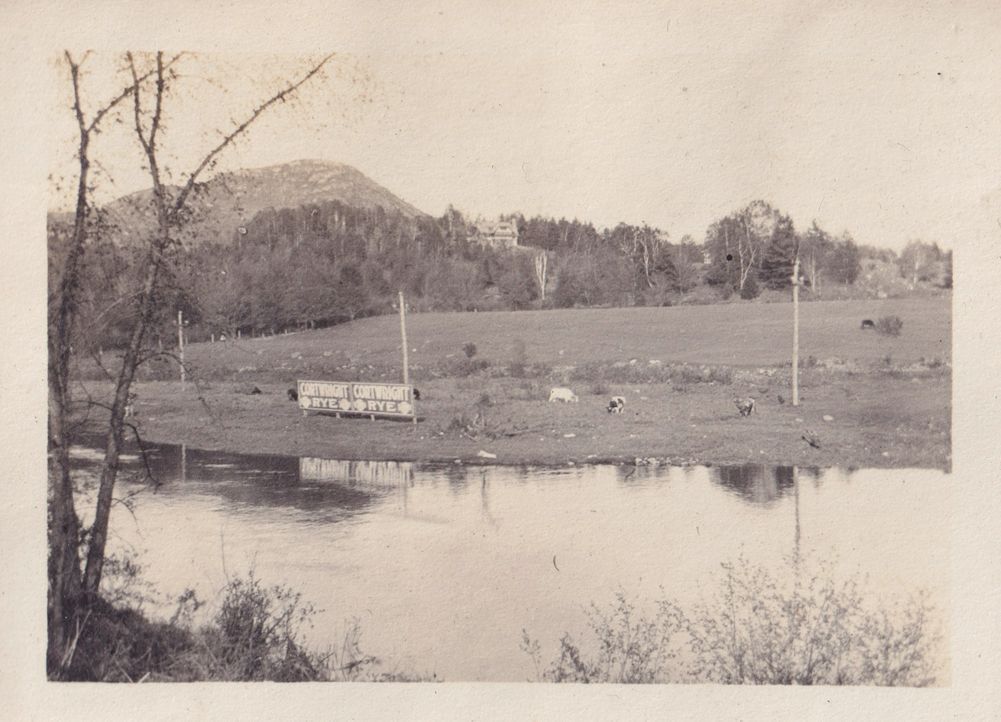 Black-and-white photograph of a lake or river with a field on the other shore. There are at least three cows on the other shore as well as a sign for Cortwright Rye.