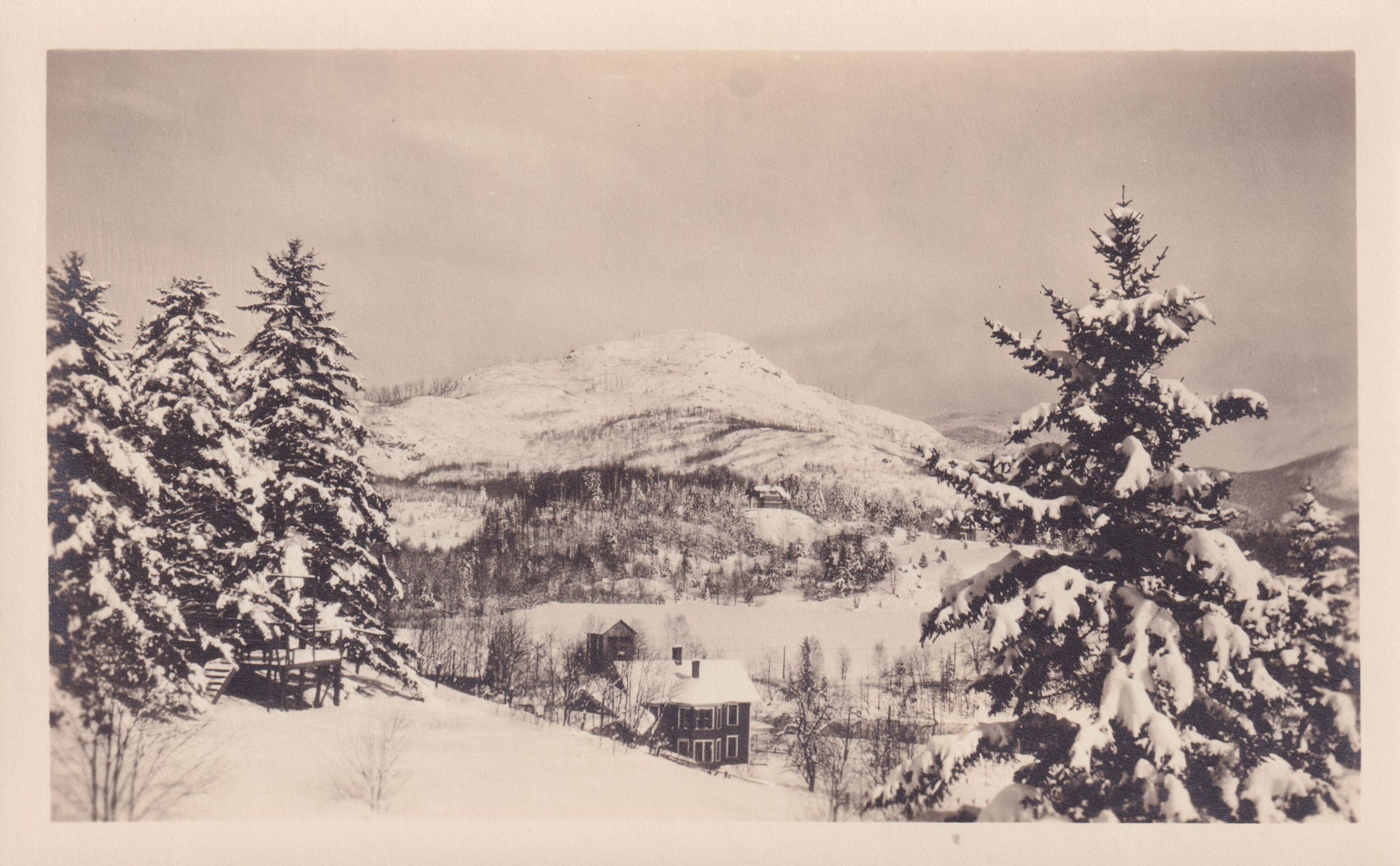 Photograph looking toward a mountain, likely Mount Baker, in the snow. Several unidentified buildings can be seen at the base of the mountain.