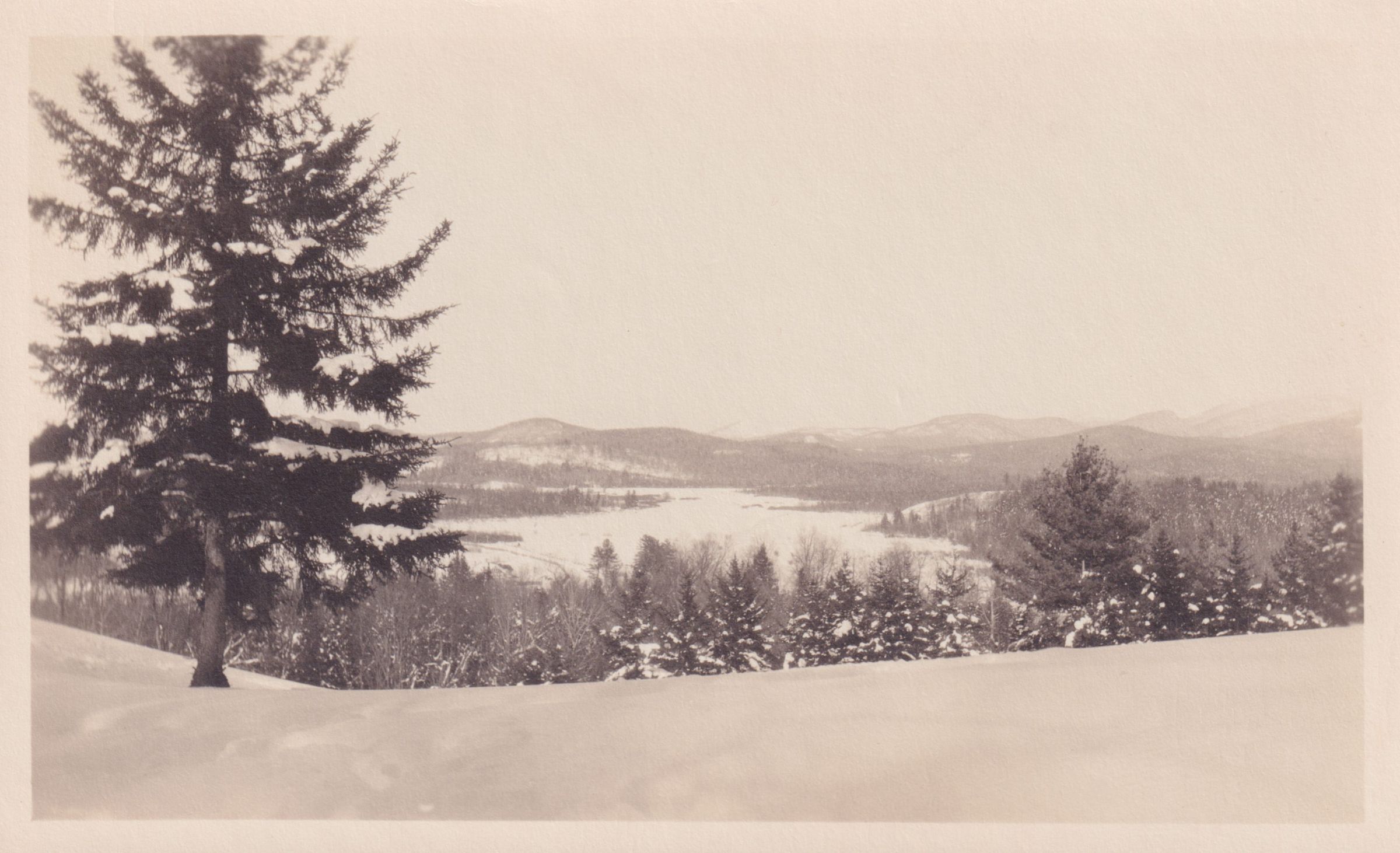 Photograph of an unidentified landscape in the snow. Mountains and evergreens are visible in the distance.