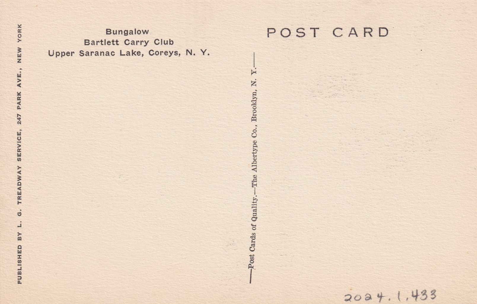 Postcard with a photograph of the bungalow at the Bartlett Carry Club.