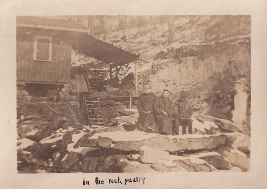 Black-and-white photograph of three men sitting on a large rock. There is a small building behind them. "In the rock quarry" is written in ink beneath the photograph.