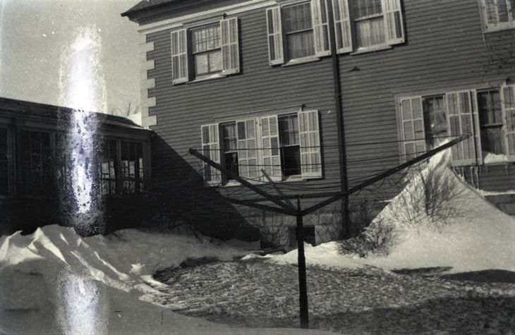 Negative of the back of a building with a drying rack in the backyard. There is melting snow in the yard as well. Most likely taken by Mary Ives Baldwin. This item is not fully cataloged but has been uploaded so the image is publicly available; if you would like us to prioritize cataloging this item, please contact the HSL Collections team.