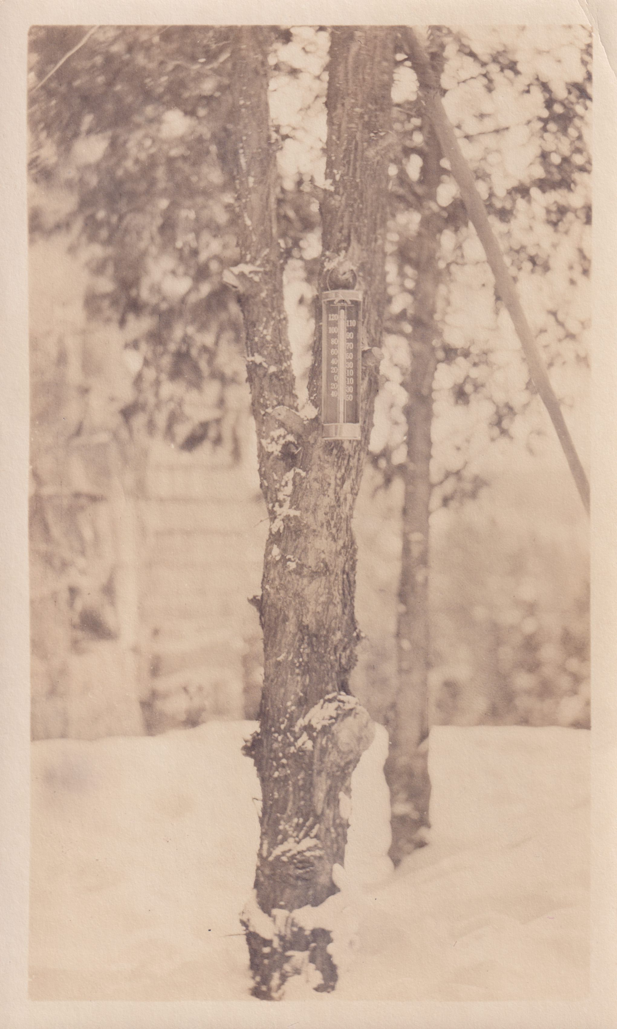 Photograph of a tree in the snow. A thermometer is hanging on the tree.