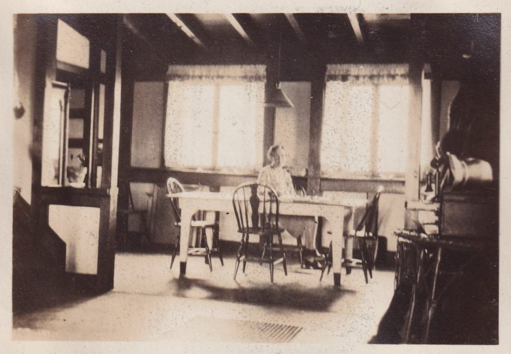 Black-and-White photograph of Amy Jones seated at the dining table in Danforth Cottage. Part of album 2024.21.1, kept by Amy Jones and David Blair Jones c. 1930-1934.