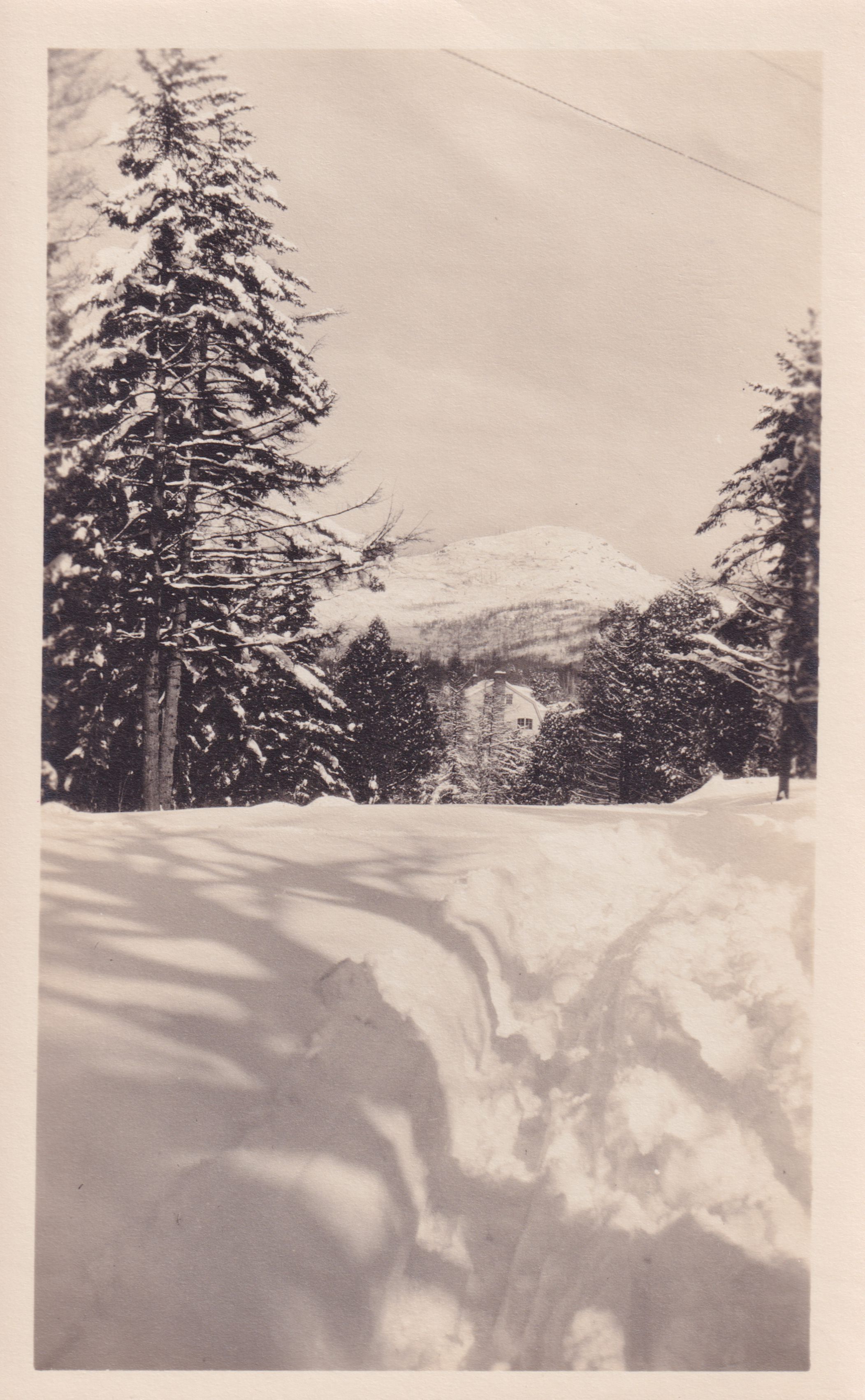 Photograph of an unidentified landscape in the snow. Snowshoe or foot tracks can be seen leading back toward an unidentified building.