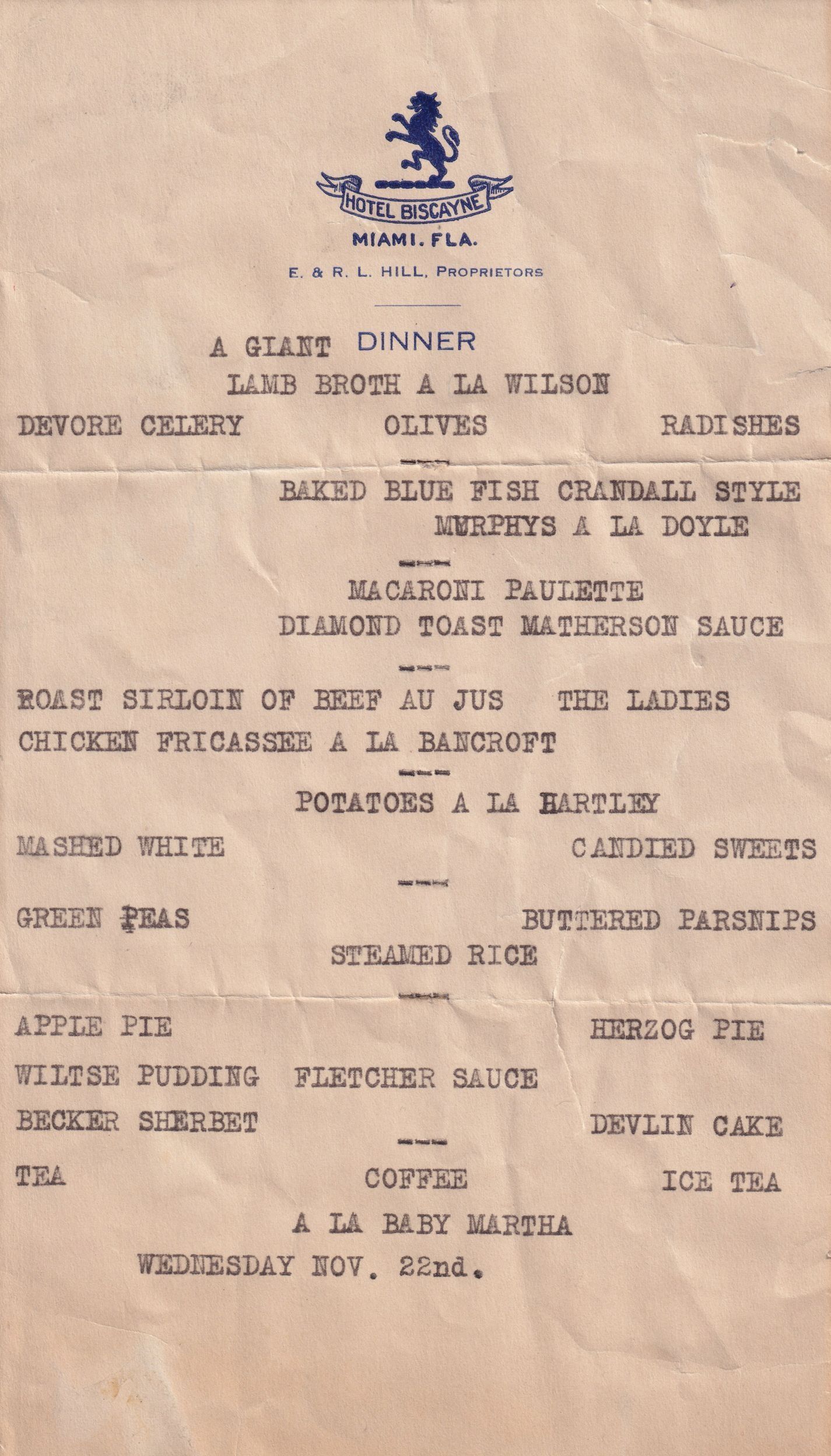 Paper menu for "A Giant Dinner" hosted at Hotel Biscayne in Miami, Florida on Wednesday, November 22, most likely hosted for or in honor of various players of the baseball team the New York Giants. The entrees and "A Giant" are all in typescript on top of a premade Hotel Biscayne dinner sheet. Meal dishes include: Lamb Broth a la Wilson, Devore Celery, Olives, Radishes, Baked Blue Fish Crandall Style, Murphys a la Doyle, Macaroni Paulette, Diamond Toast Matherson Sauce, Roast Sirloin of Beef Au Jus, The Ladies, Chicken Fricasse a la Bancroft, Potatoes a la Hartley, Mashed White, Candied Sweets, Green Peas, Buttered Parsnips, Steamed Rice, Apple Pie, Herzog Pie, Wiltse Pudding, Fletcher Sauce, Becker Sherbet, Devlin Cake, Tea, Coffee Ice Tea, A la Baby Martha."Lexicon