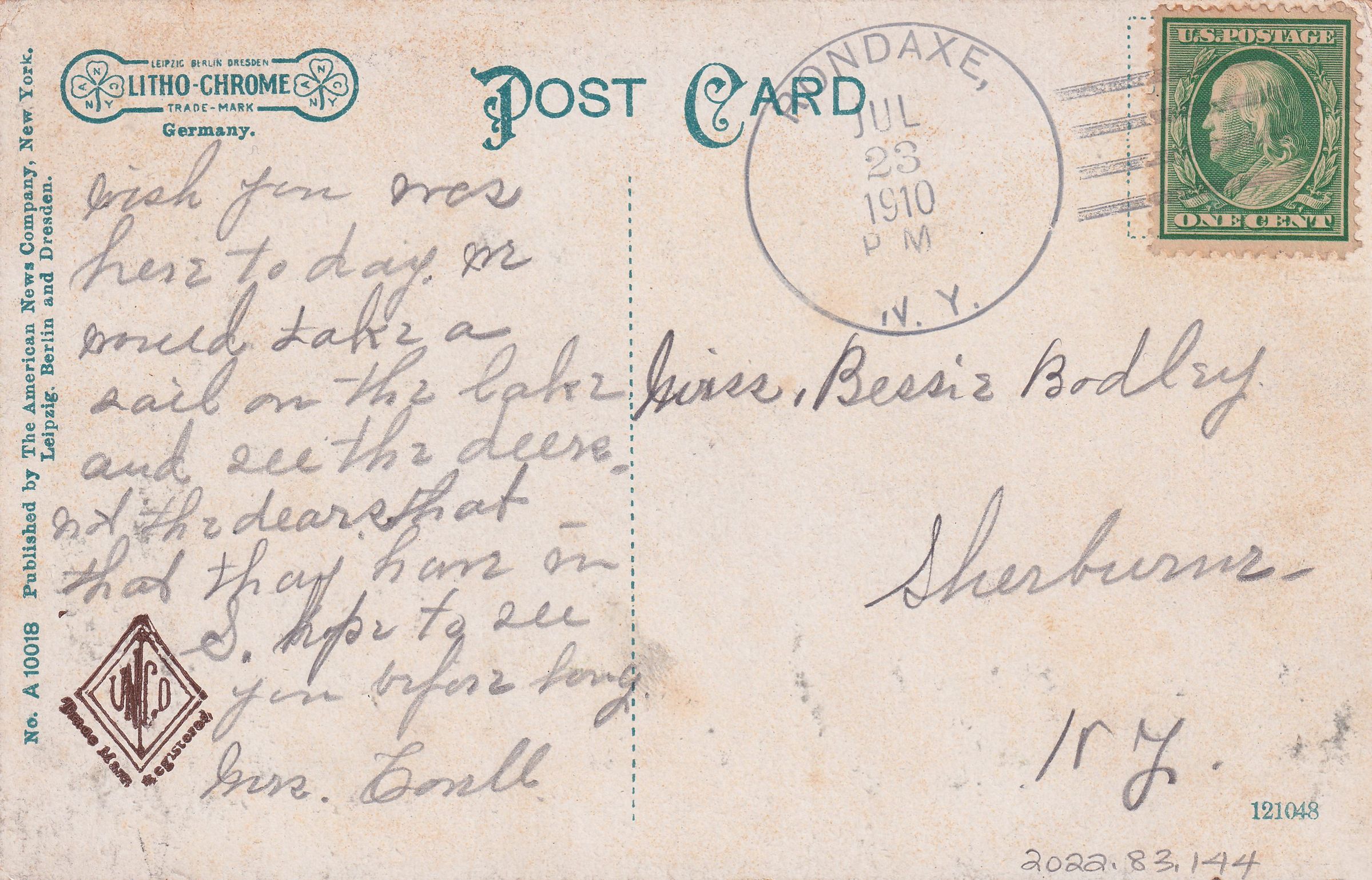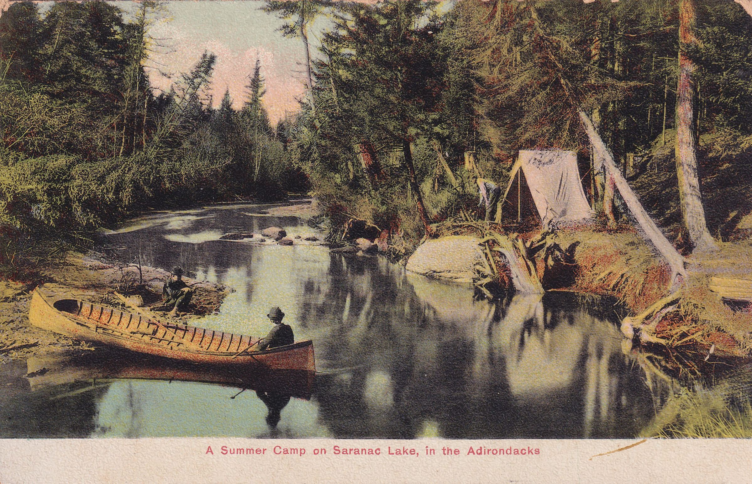 Color postcard showing a person seated in a guideboat on a river. There is a canvas tent pitched on the opposite side of the river, with a man bending over in front. Printed caption on front reads, "A Summer Camp on Saranac Lake, in the Adirondacks." Printed by the American News Company, New York. Used, divided back, white space for message on front, postmarked Rondaxe, NY, July 23, 1910. Handwritten message on back reads, "Wish you was here to day. We could take a sail on the lake and see the deere. Not the dears that thay has in S. Hope to see you before long. Mrs. [?]." Mailed to Miss Bessie Bodley, Sherburne, NY.Subject Place