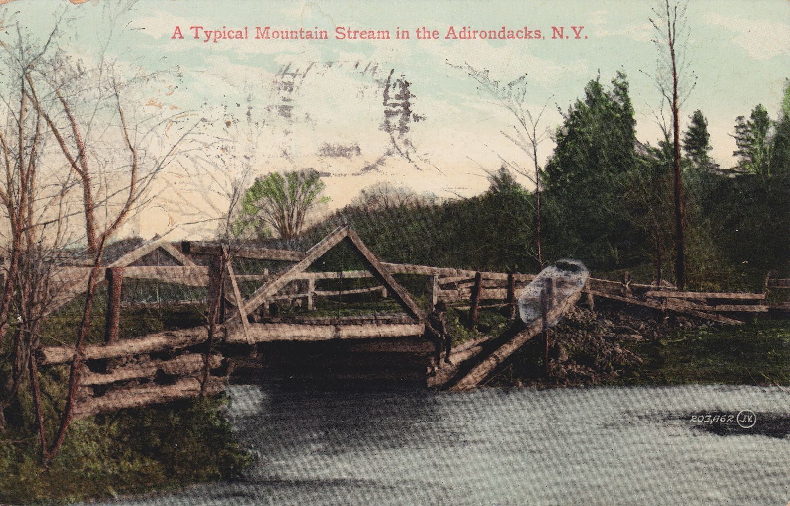 Color postcard showing a stream under a wooden bridge. Printed caption on front reads, "A Typical Mountain Stream in the Adirondacks, N. Y." Printed by the Valentine & Sons' Publishing Co., Ltd., New York. Used, divided back, postmarked Saranac Lake, August 23, 1908.