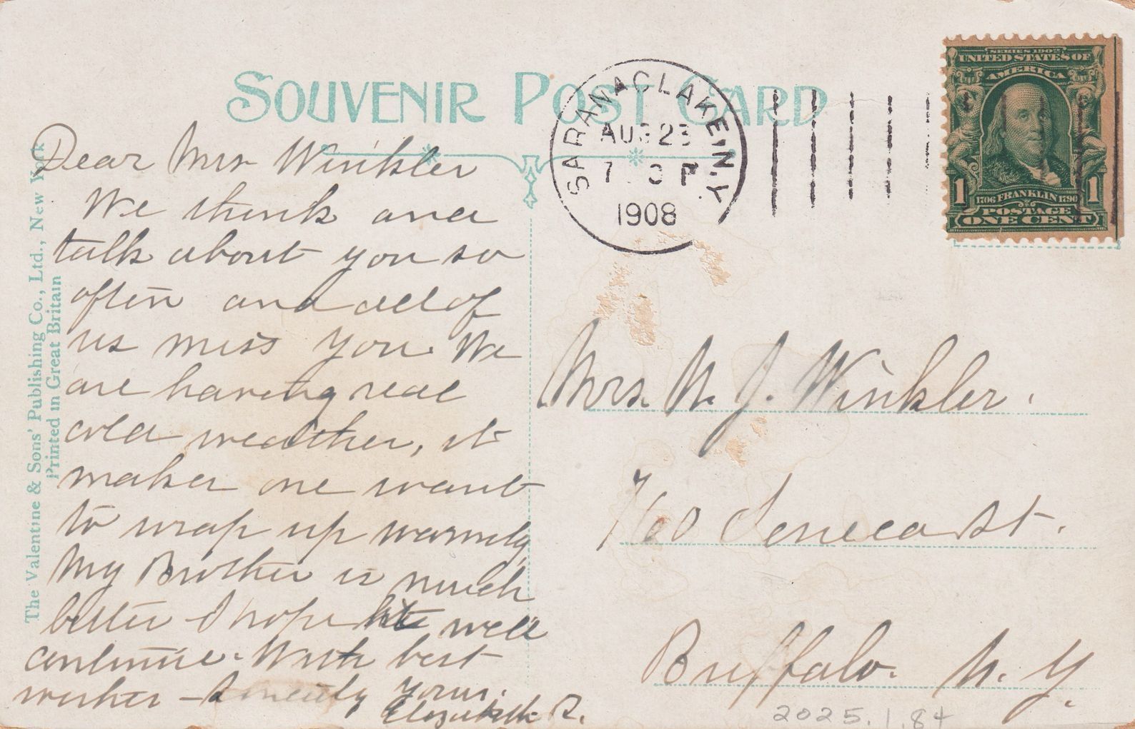 [Part of a group of cards mailed from various writers in Saranac Lake to Mrs. N. J. Winkler of Buffalo. See 2025.1.77 - 2025.1.84 for the rest of the cards.]Collection