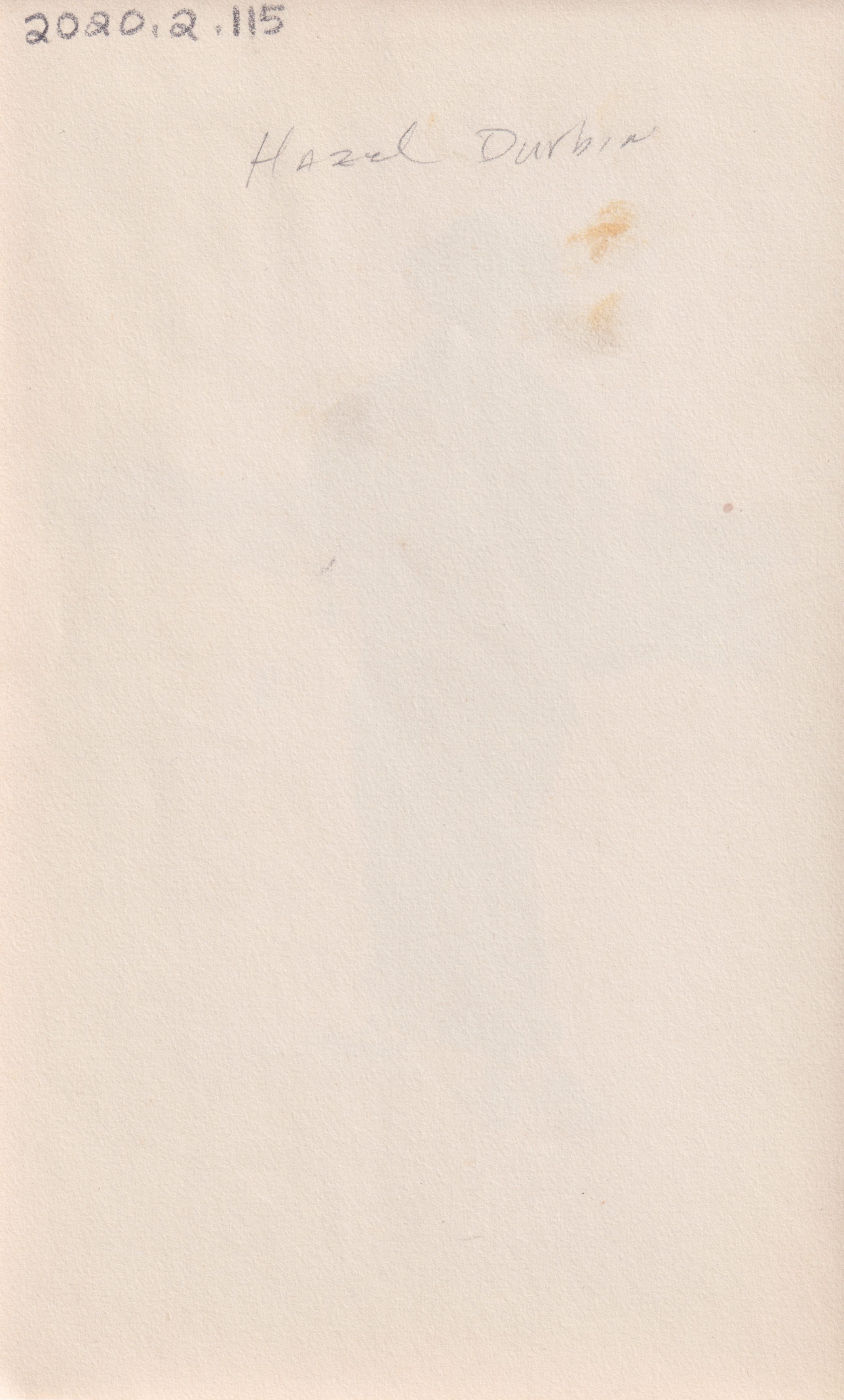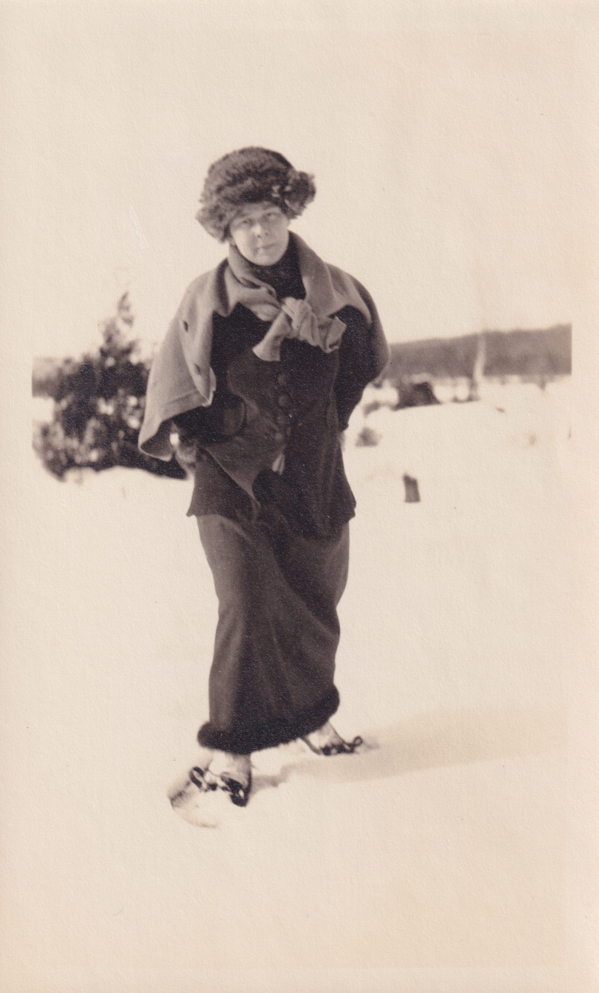 Photograph of Hazel Durbin standing wearing snowshoes. Handwritten caption on reverse reads, “Hazel Durbin.”