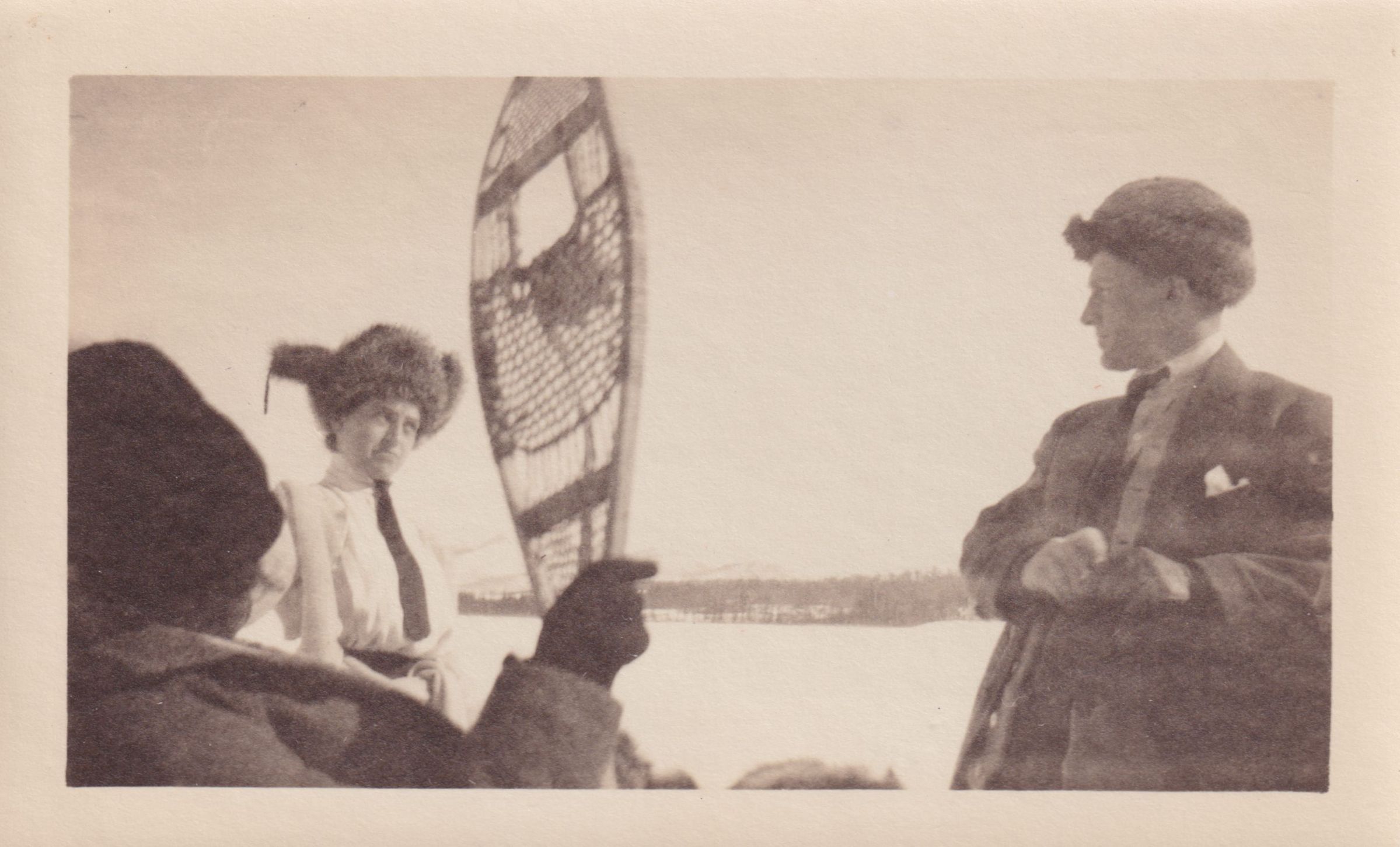 Photograph of a man and a woman dressed in winter clothing. A portion of a person is visible in the foreground holding a snowshoe. A frozen lake is visible behind them. This photograph is the same as 2020.2.1.10.