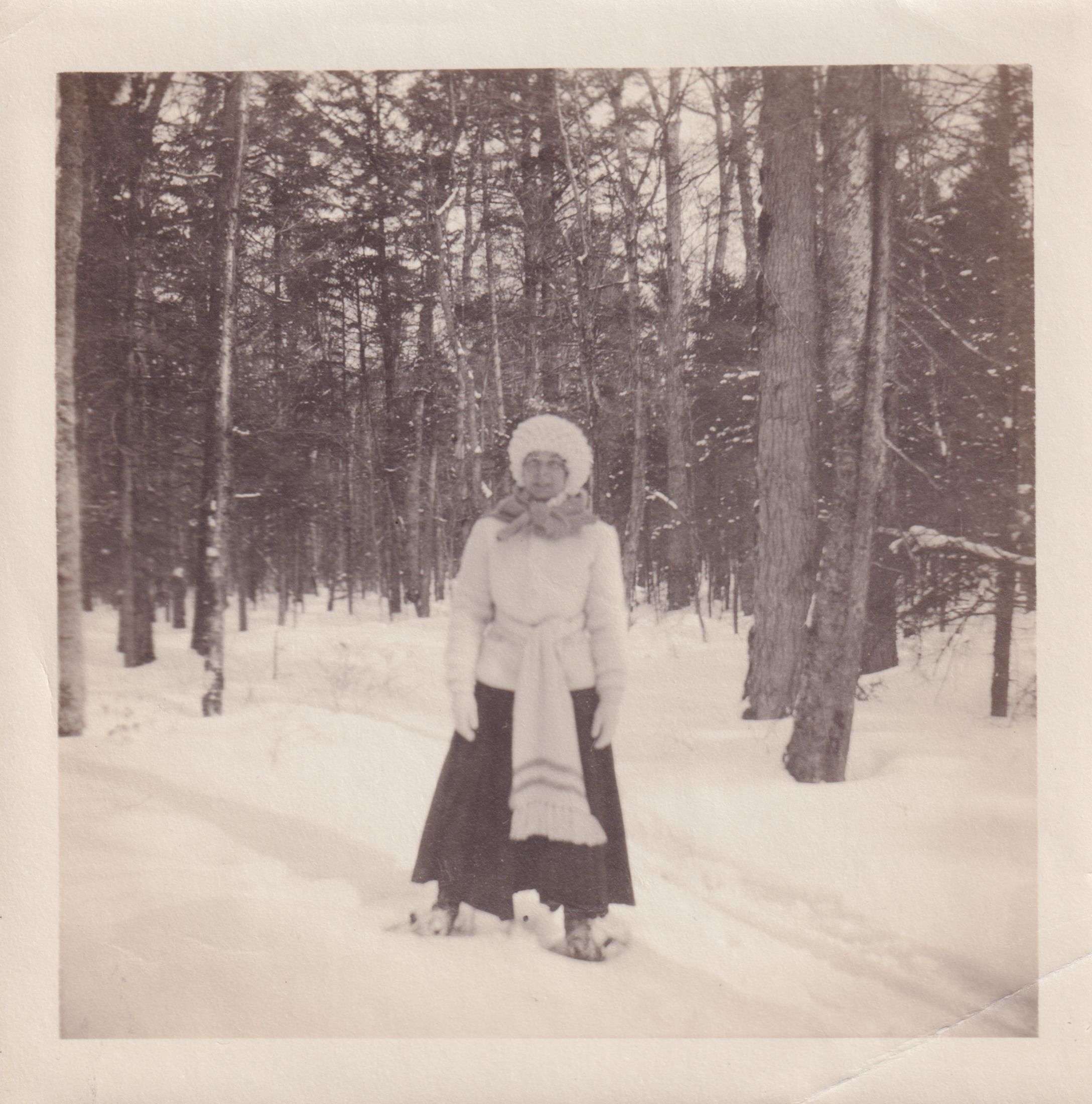 Photograph of a Hazel Durbin wearing snowshoes in the snowy woods. She is dressed in winter clothing. This is the same photograph as 2020.2.1.24.