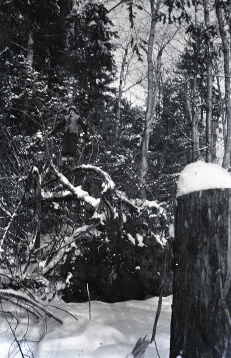 Negative of a snow-covered wooded area. A snow-covered tree stump is in the foreground of the image. Henry Ives Baldwin is standing on a downed tree in the back left of the image. Most likely taken by Mary Ives Baldwin. This item is not fully cataloged but has been uploaded so the image is publicly available; if you would like us to prioritize cataloging this item, please contact the HSL Collections team.