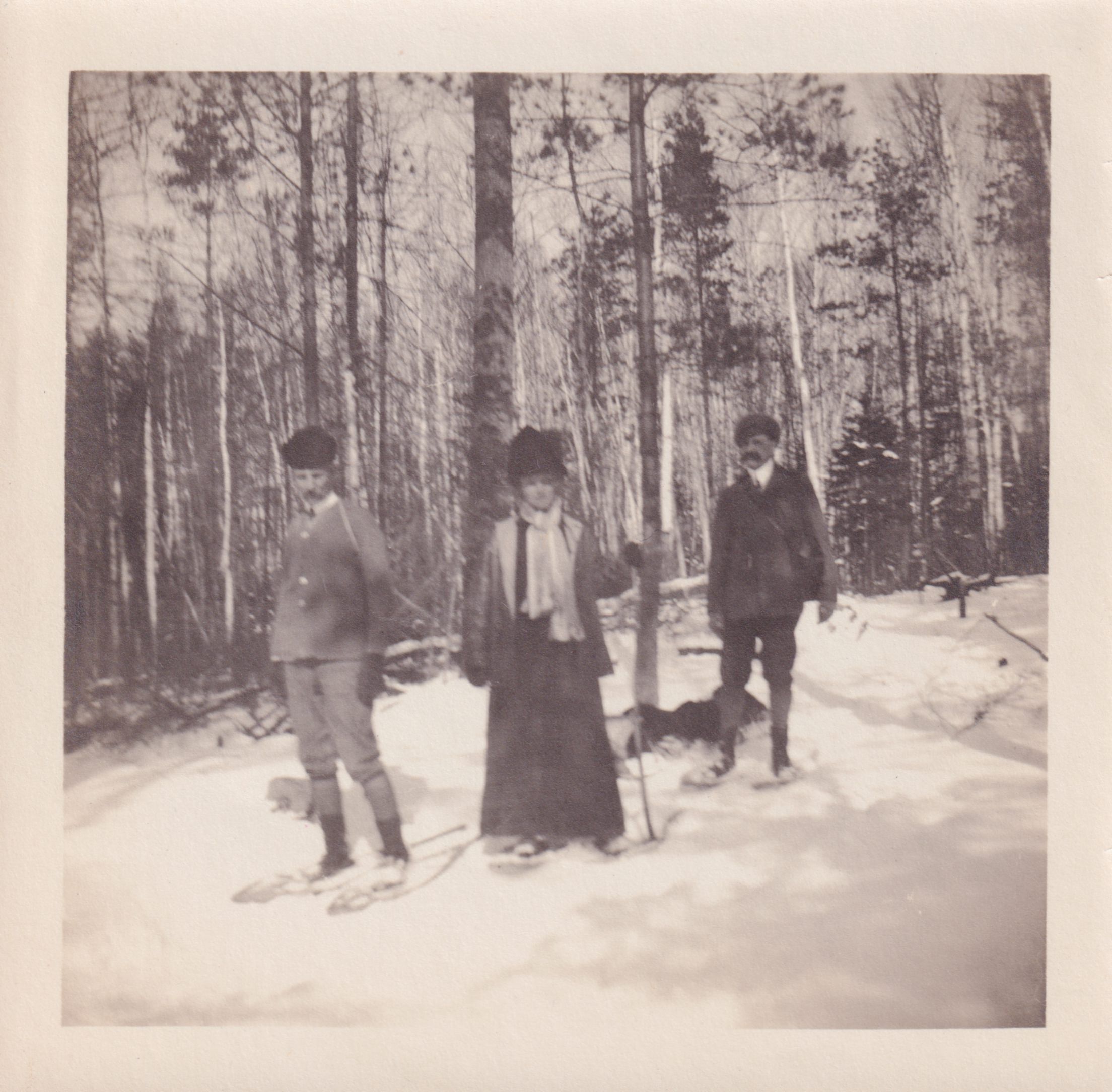 Photograph of three unidentified people standing on snowshoes in the woods.