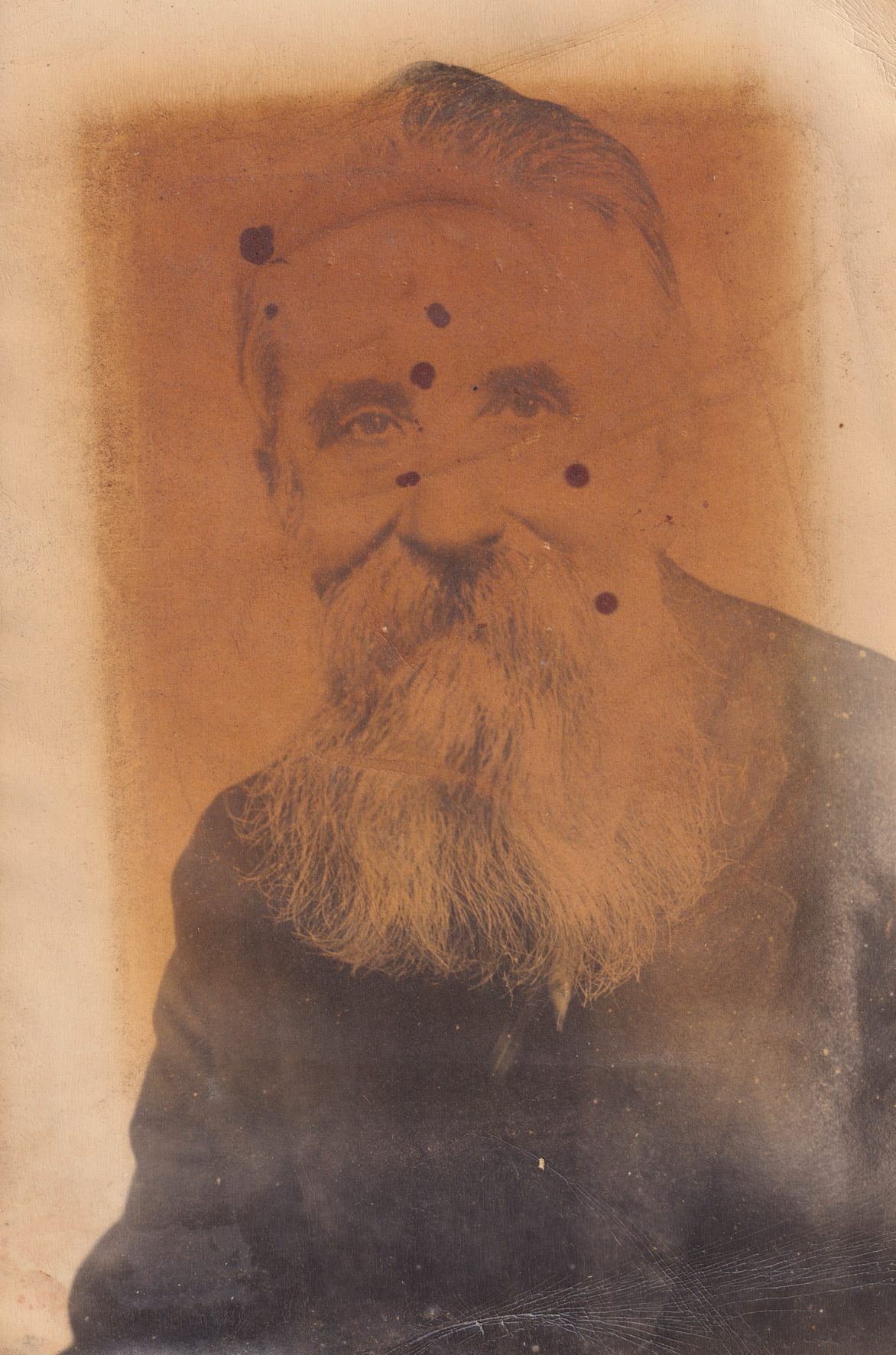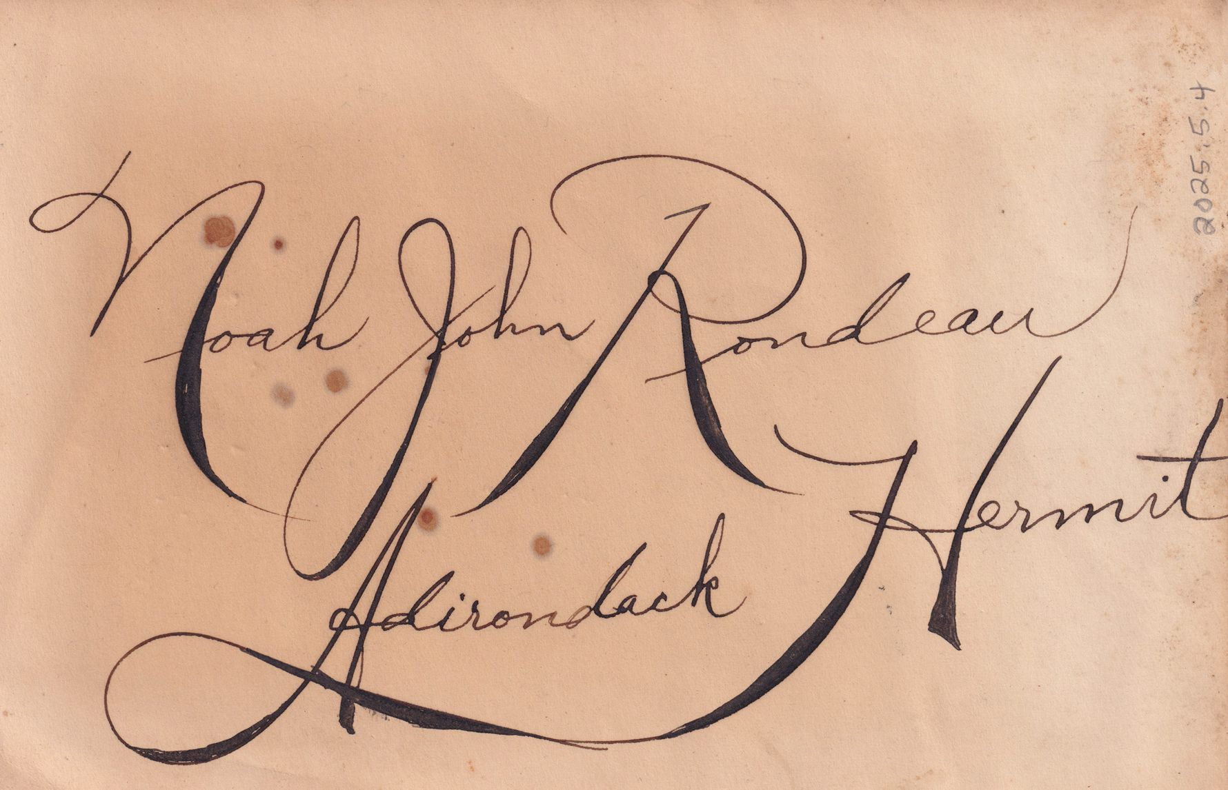 Black-and-White studio portrait photograph of Noah John Rondeau. Signed "Noah John Rondeau, Adirondack Hermit," on reverse in Rondeau's signature script.