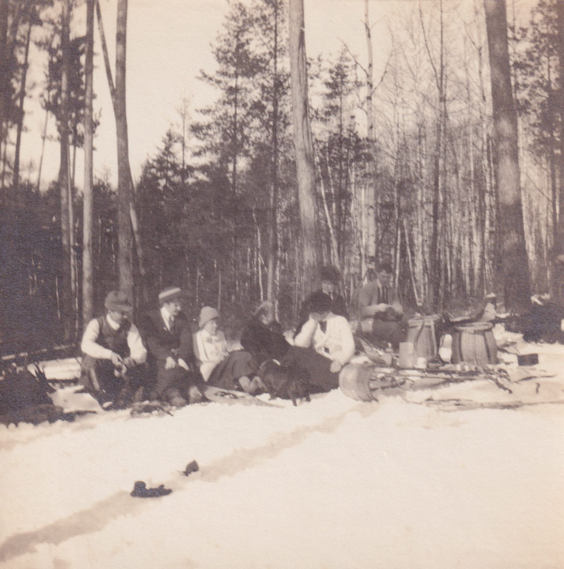 Photograph of a group of unidentified men and women sitting in the snow in the woods. They are surrounded by pack baskets, snowshoes, and a toboggan.Collection
