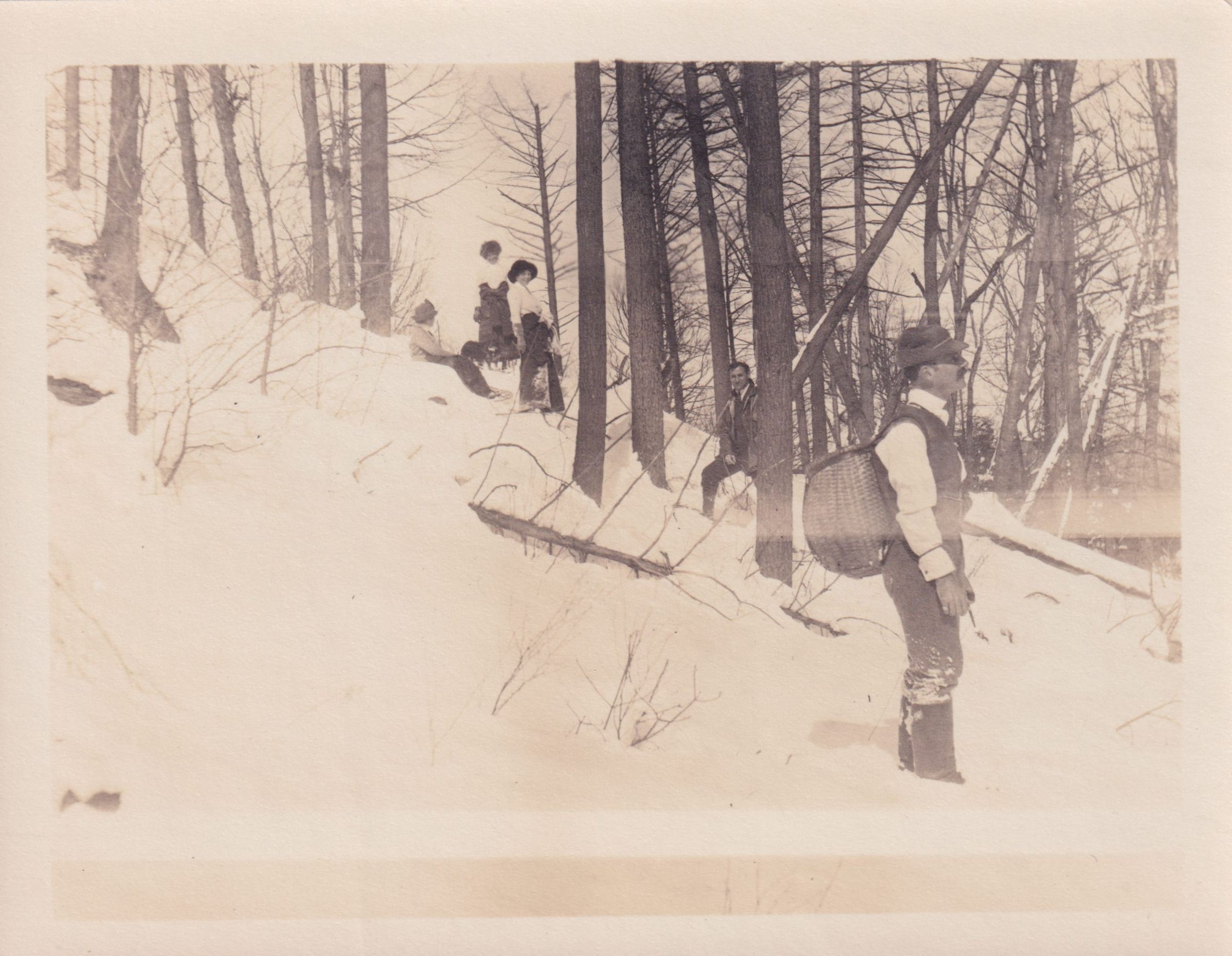 Photograph of a group of unidentified people walking through the snowy woods. A man in the foreground is wearing a pack basket.