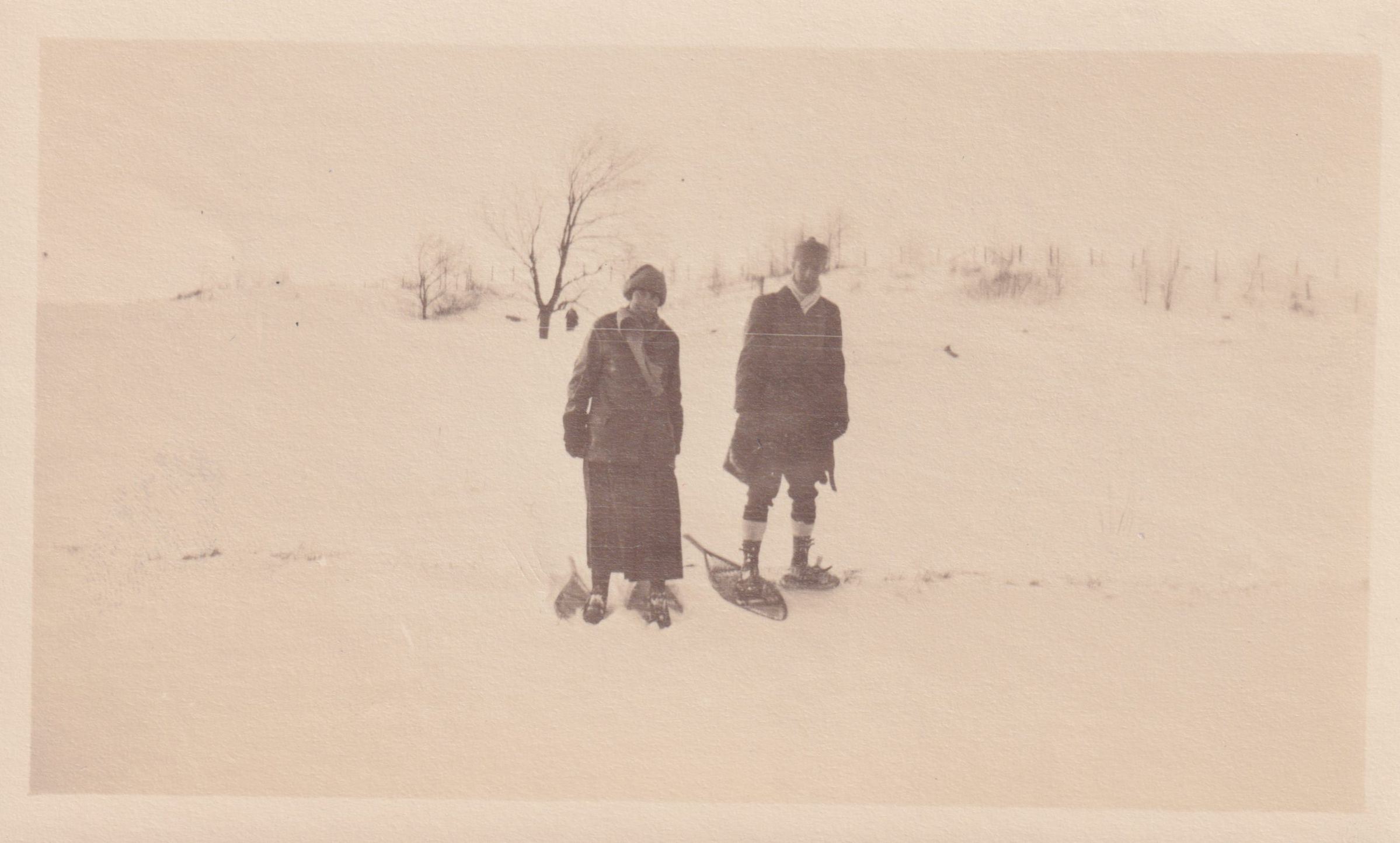Photograph of Hazel and Fletcher Durbin wearing snowshoes and winter gear.