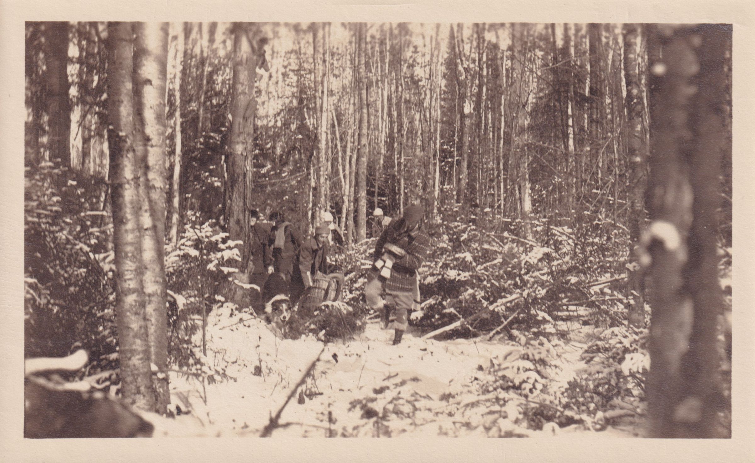 Photograph of a group of people and a dog walking through the snowy woods. They are carrying pack baskets and other items.