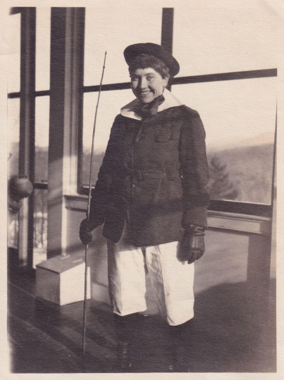 Black and white photograph of a woman in a jack, hat, and gloves standing in front of a large window. She is holding a stick in her right hand.