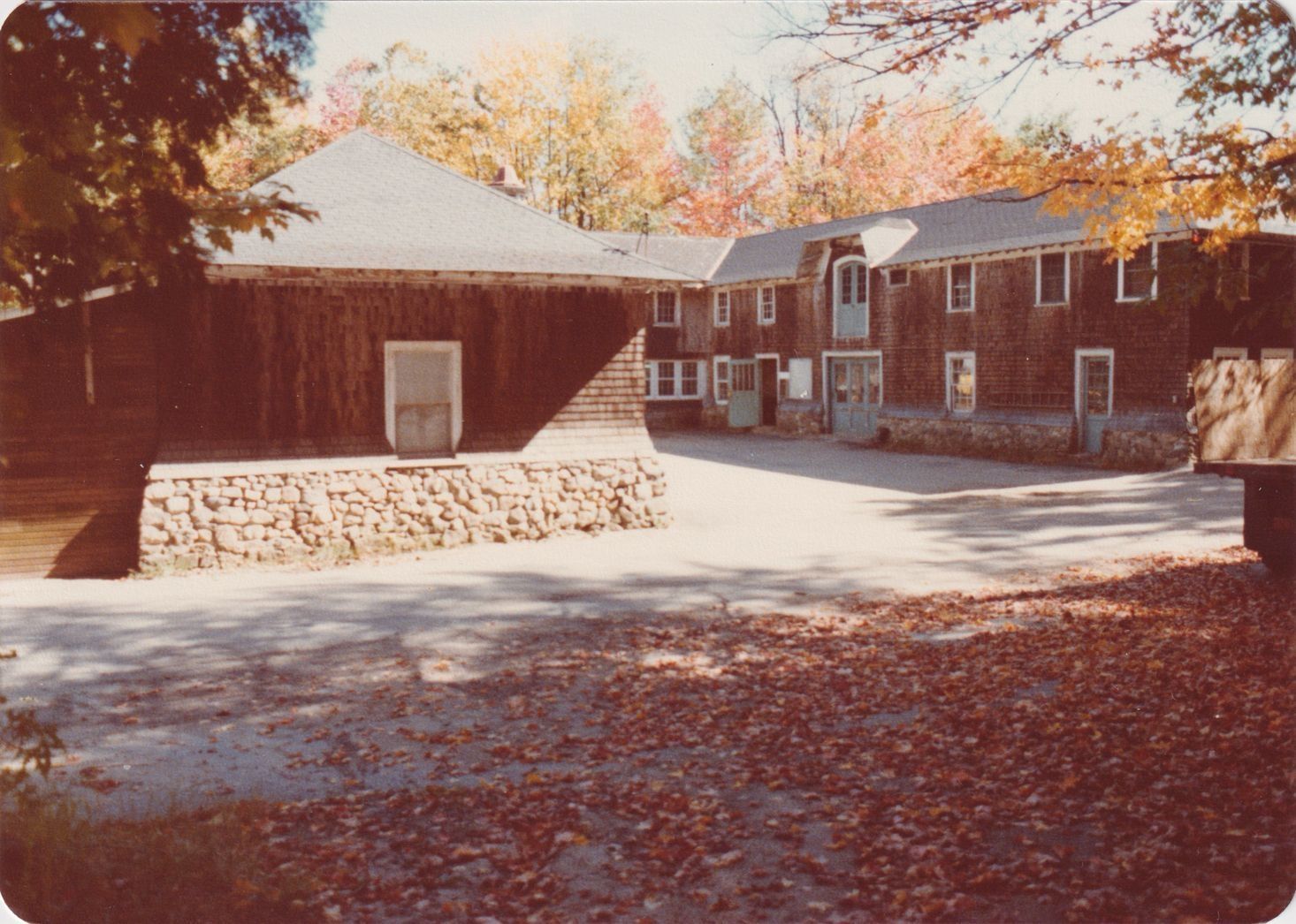 Color photograph of a U-shaped building, known as McGibbon's Stable when it was part of the Trudeau Sanatorium, but part of the American Management Association grounds at the time of this photograph.