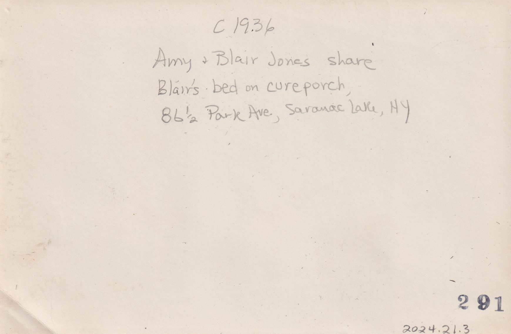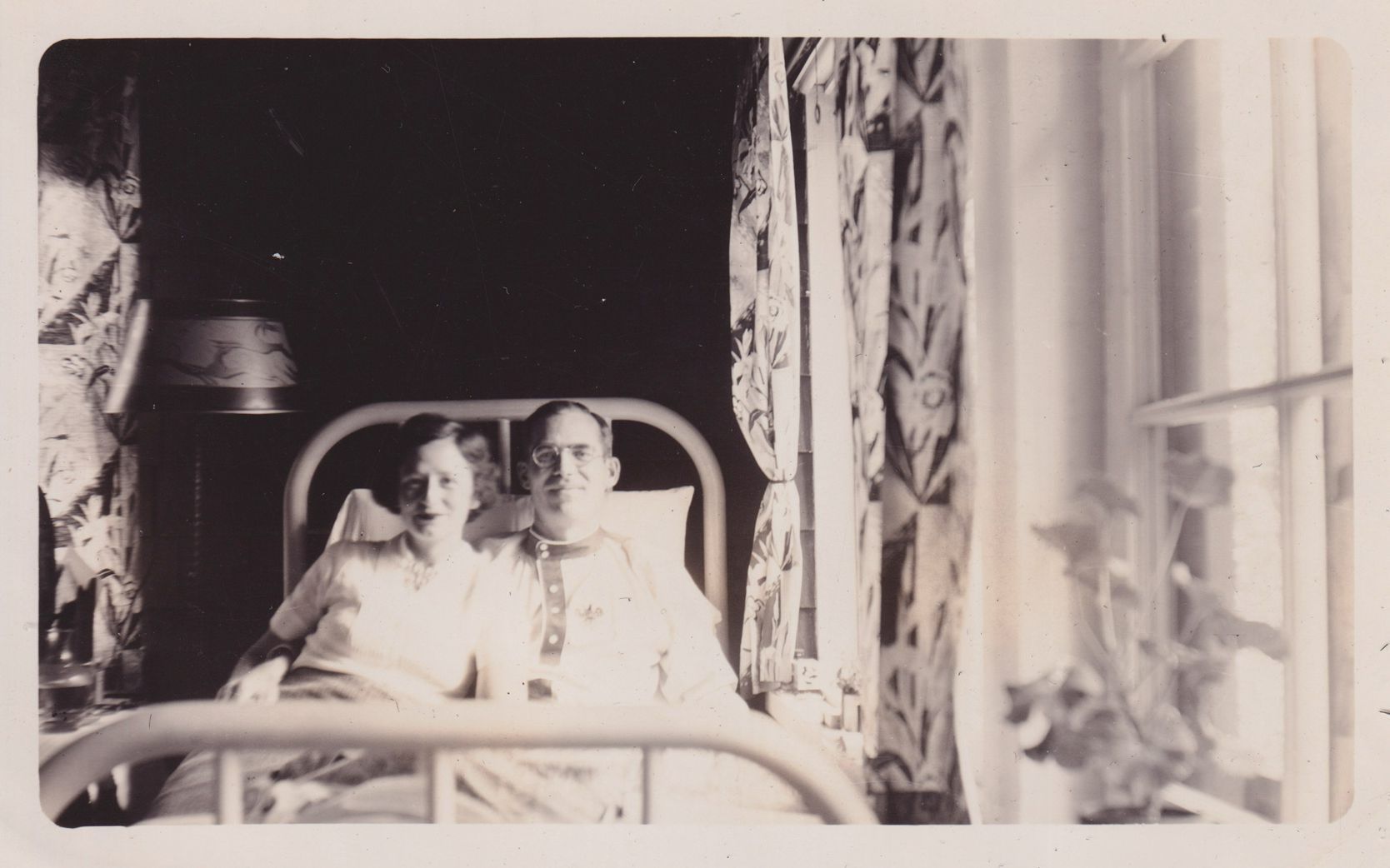 Black-and-White photograph of (L to R) Amy Jones and David Blair Jones sitting up in bed. Large windows can be seen on the right hand side of the room. Handwritten caption on back reads, "c. 1936. Amy & Blair Jones share Blair's bed on cure porch, 86 1/2 Park Ave., Saranac Lake, NY." Print has decorative scalloped edges.Photograph Details