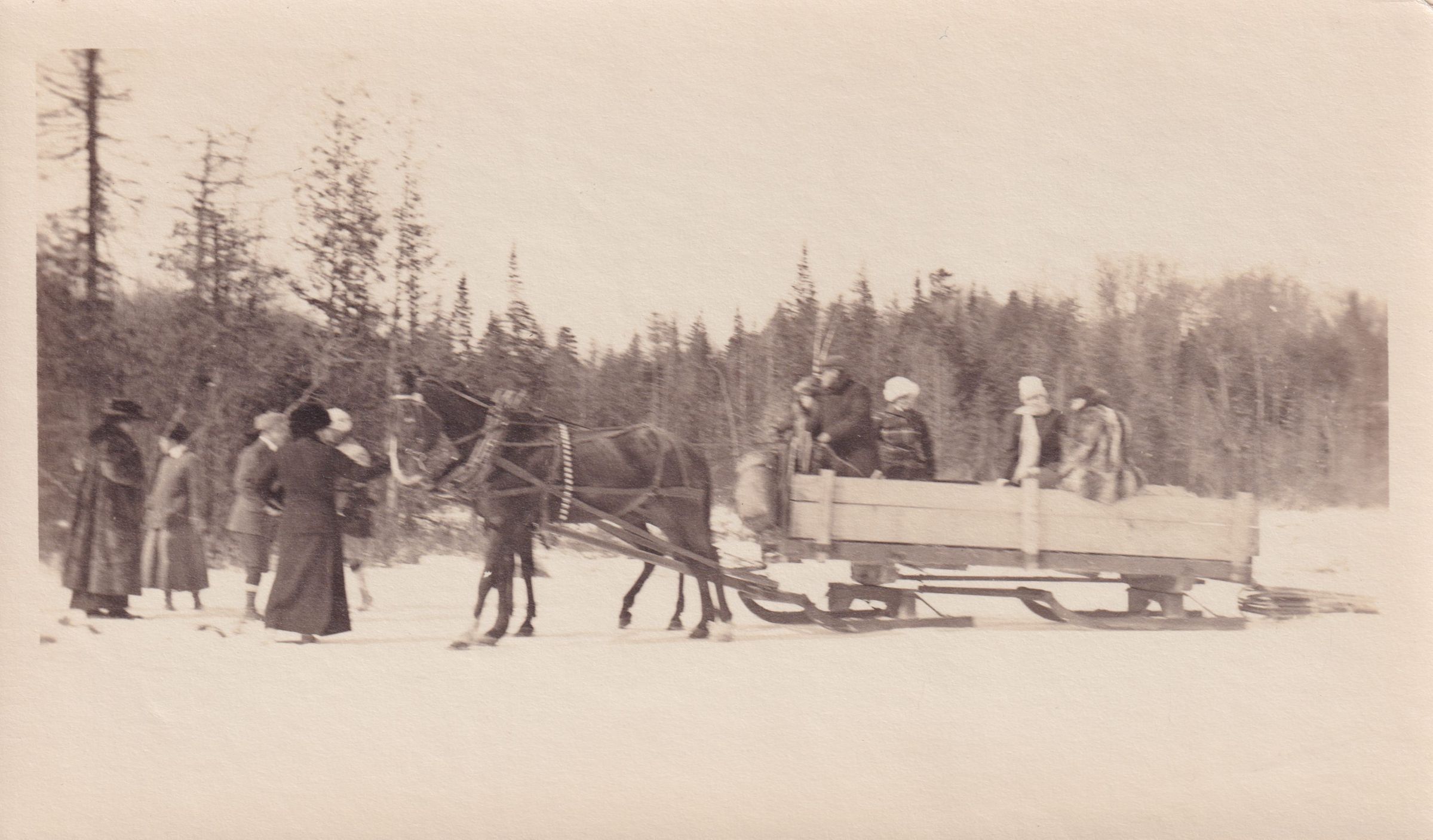 Photograph of a horse-drawn sled on the snow or ice. Several people are seated in the sled, and others stand in front looking at the horses.