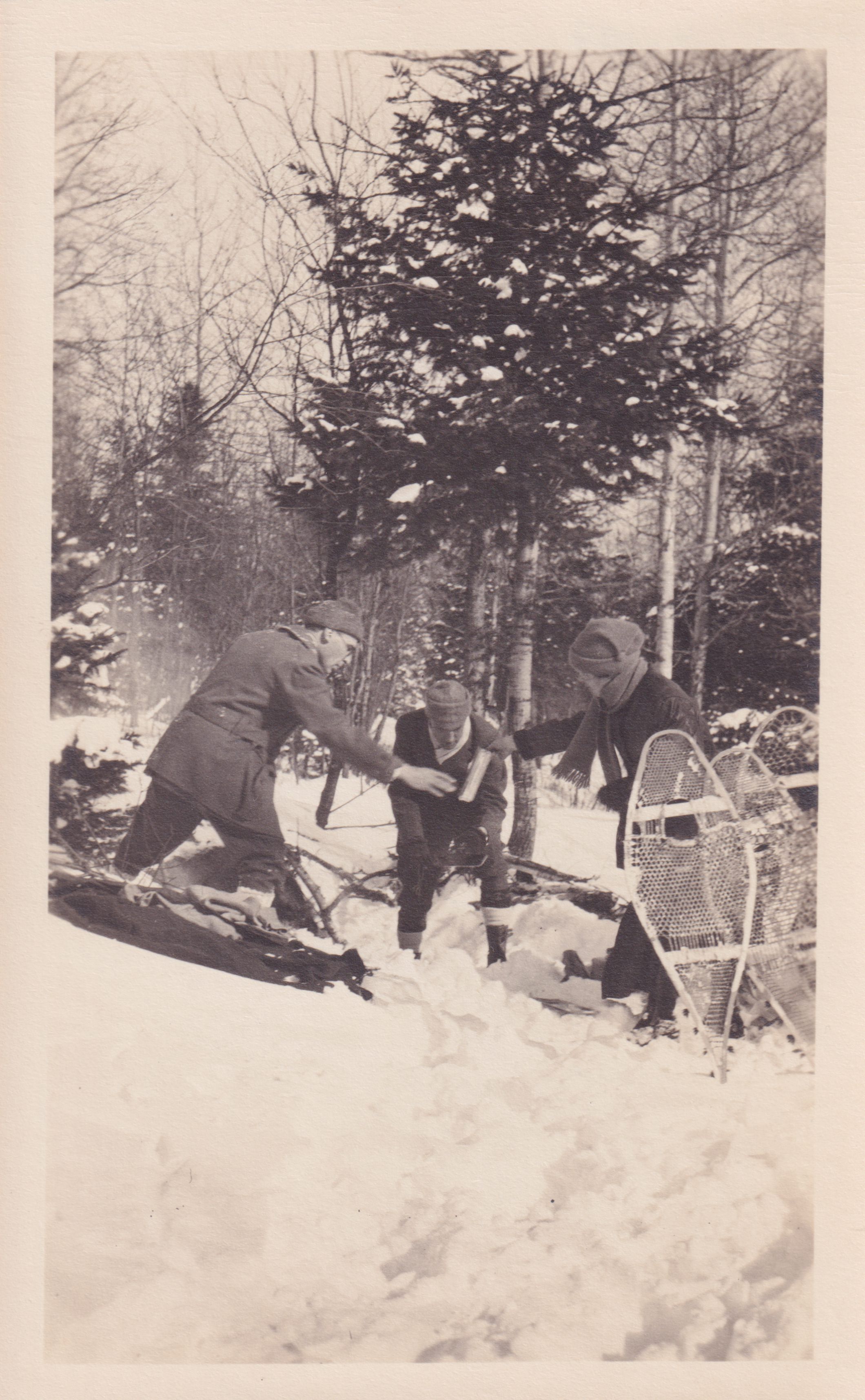 Photograph of a group of people in the snow. Two people are passing an object between them. They are surrounded by items in the snow, including snowshoes.