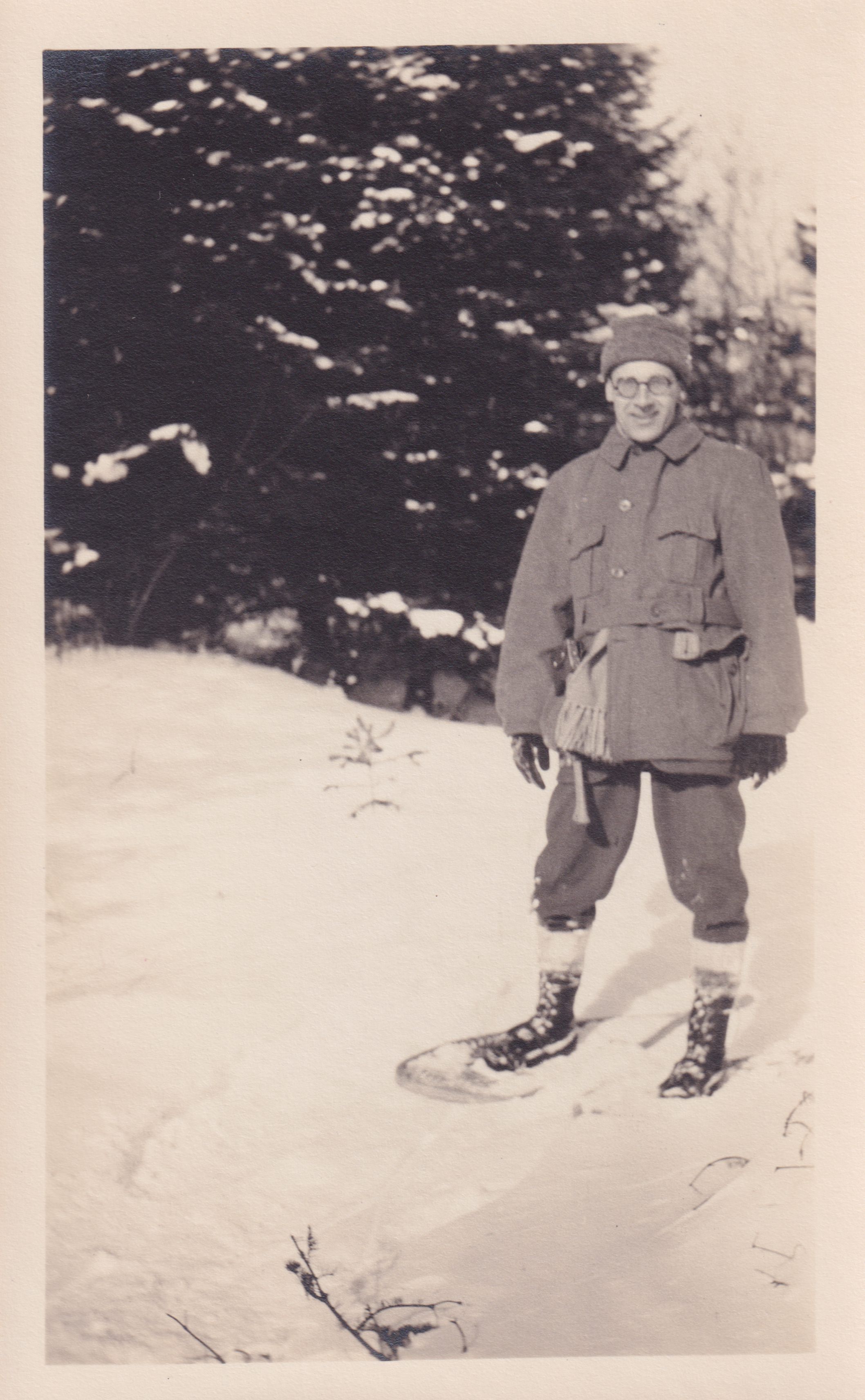 Photograph of an unidentified man wearing snowshoes. He is wearing glasses and dressed in winter gear.