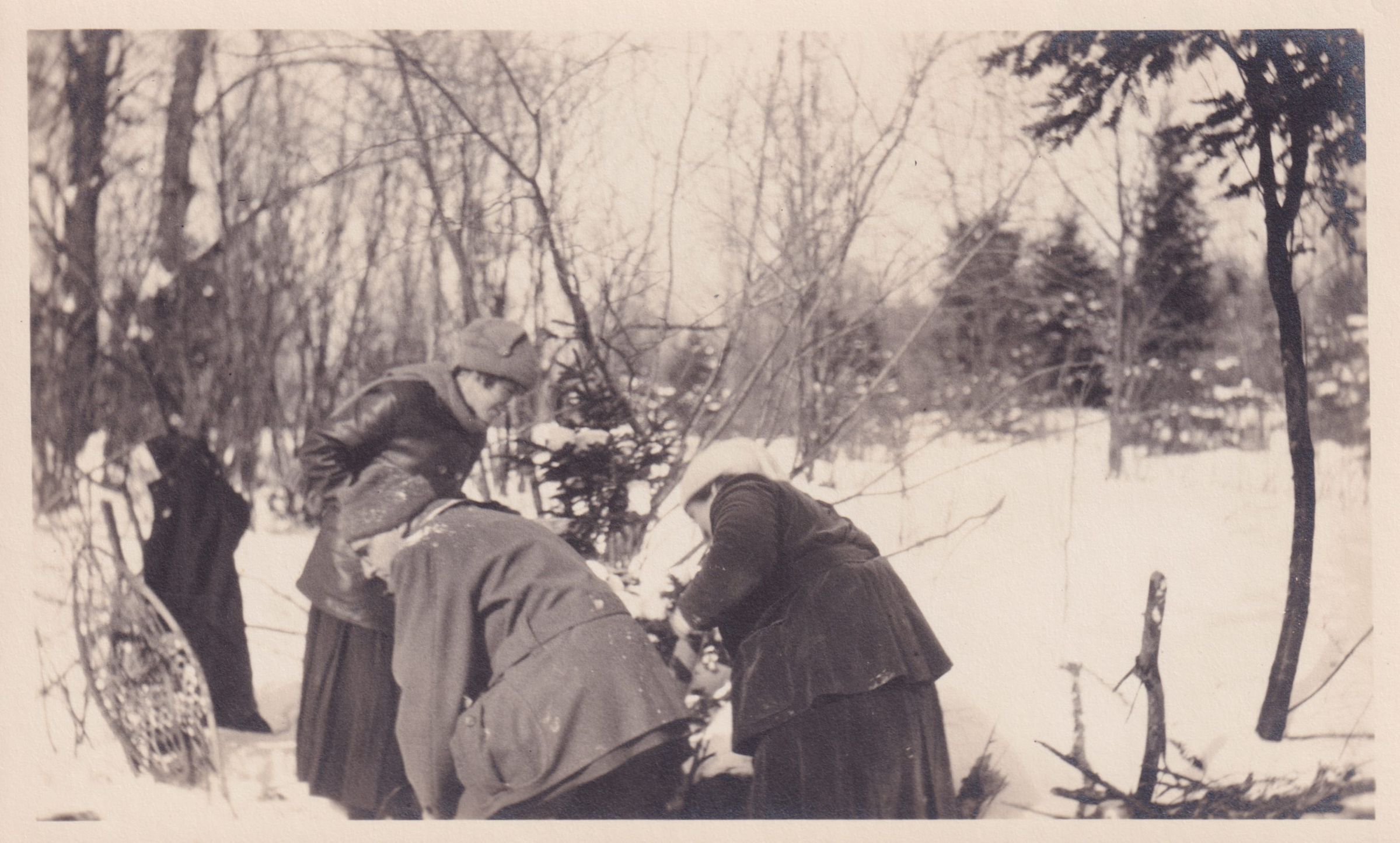 Photograph of a group of people in the snowy woods. Some of them are bent over with their backs to the photographer. Snowshoes can be seen in the background.