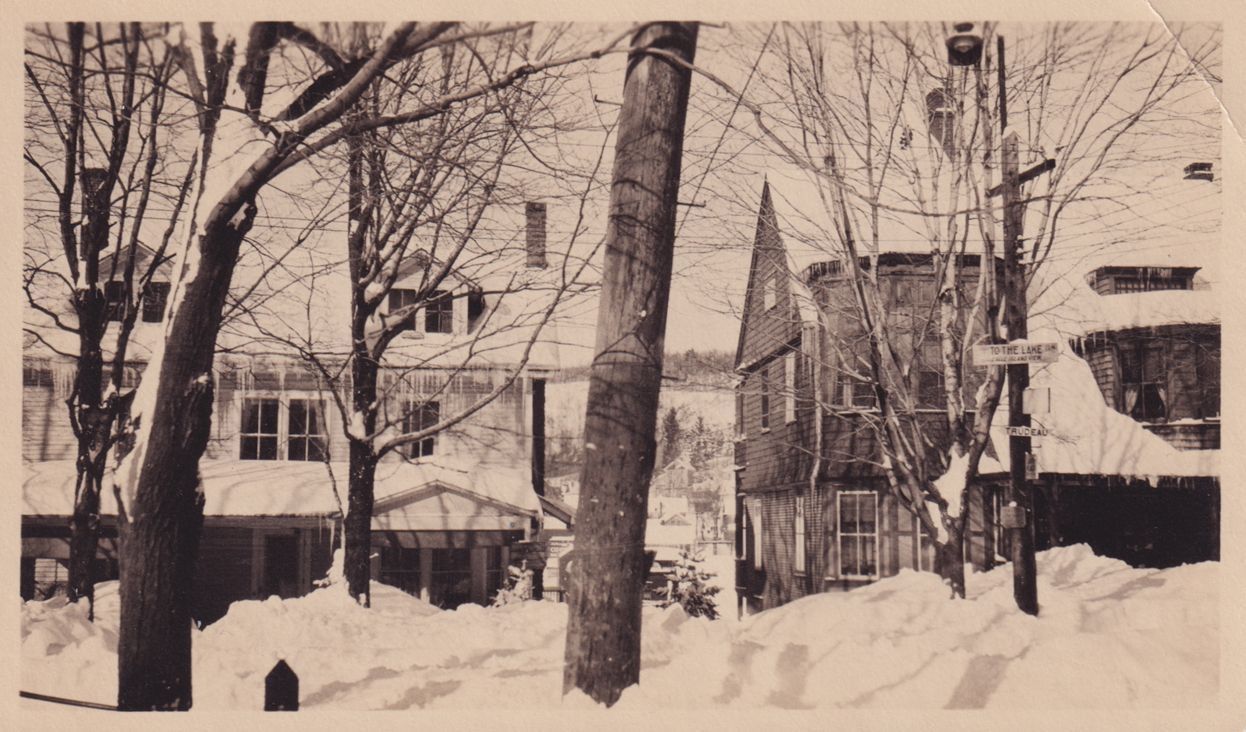 Black and white photograph of a two house covered in snow with large snow drifts in front of them. The view of the front porch of the cottage is blocked by a large snow drift.