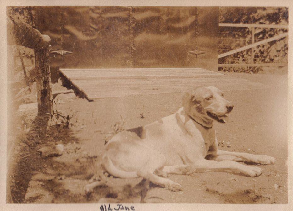 Black-and-white photograph of a dog sitting outside on the ground. There is a fence and wall of metal behind her. "Old Jane" is written in ink beneath the photograph.