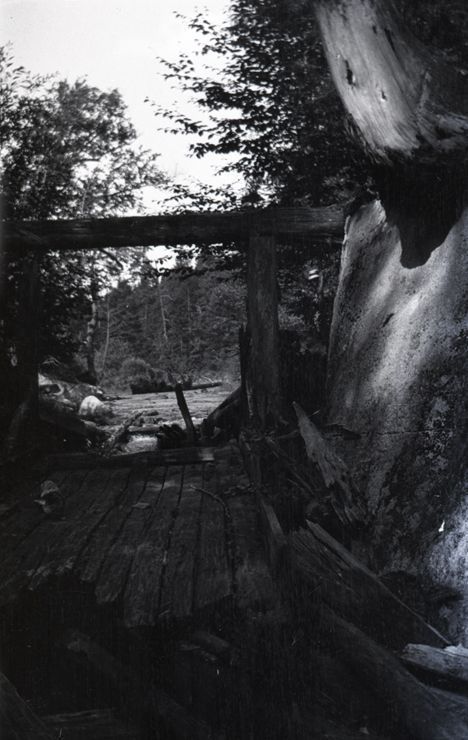 Negative of a wooden bridge/entrance to a path. An open area can be seen through the entrance. To the right of the entrance is a large boulder with a tree growing above. Most likely taken by Mary Ives Baldwin. This item is not fully cataloged but has been uploaded so the image is publicly available; if you would like us to prioritize cataloging this item, please contact the HSL Collections team.