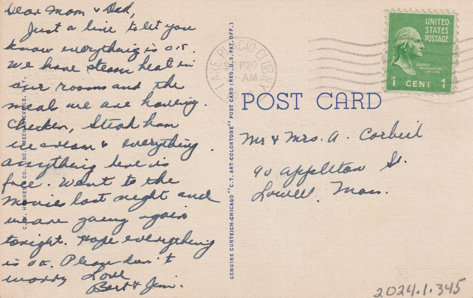 Postcard with an illustration of Lower Saranac Lake. The postcard is addressed to Mr. and Mrs. A. Corbeil.