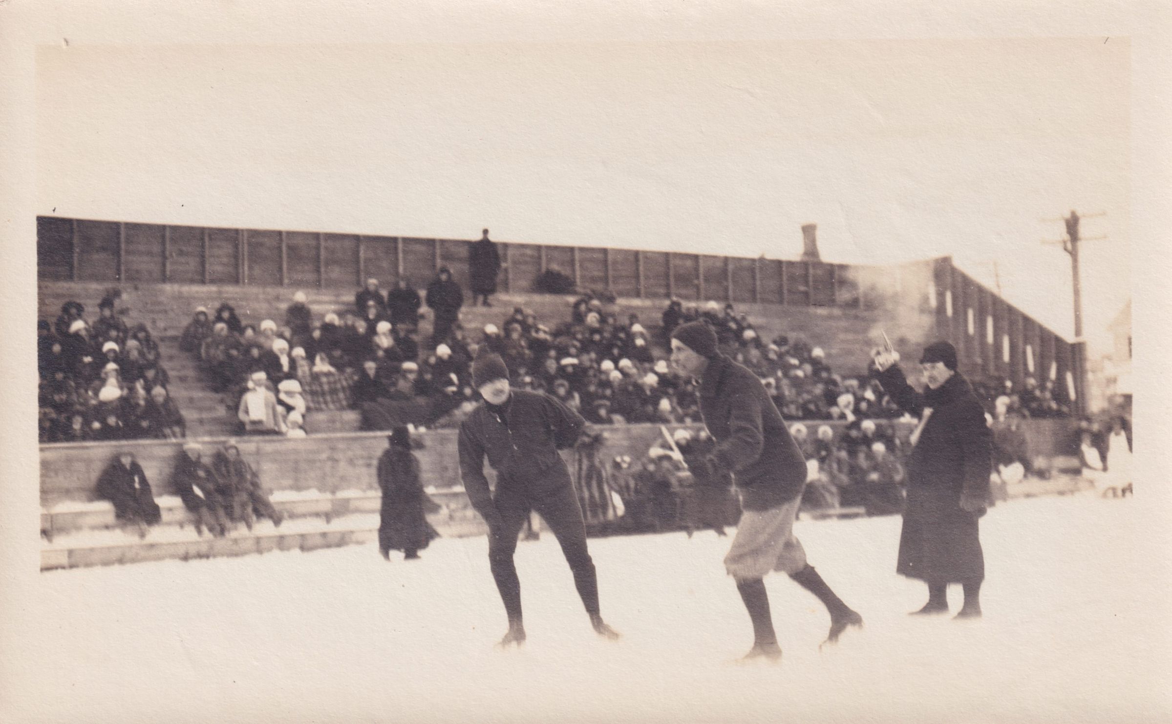Photograph of two men about to take off in a skating race on Pontiac Bay on Lake Flower. A man standing behind them is holding a starting pistol up in the air. Spectators can be seen sitting in the stands behind them.