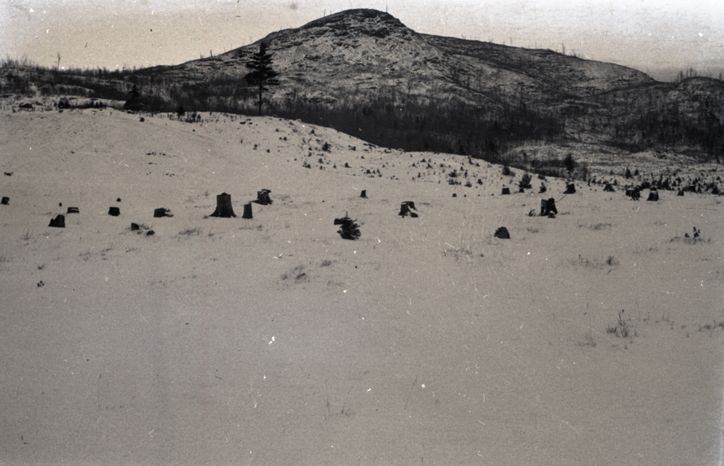 Negative of snowy area with tree stumps and a hill in the background. Most likely taken by Mary Ives Baldwin. This item is not fully cataloged but has been uploaded so the image is publicly available; if you would like us to prioritize cataloging this item, please contact the HSL Collections team.