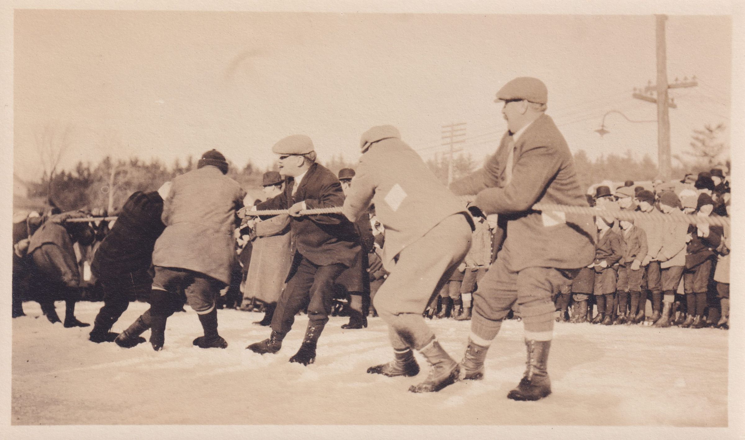 Photograph of a group of people playing tug of war on the ice on Pontiac Bay on Lake Flower. Spectators can be seen behind them.