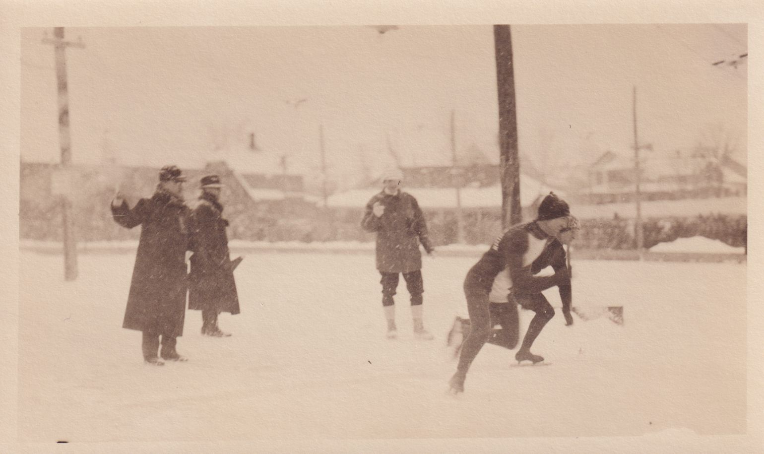 Photograph of two men racing on ice skates on Pontiac Bay on Lake Flower. A judge is standing behind them with a starting pistol. The skater at right may be Ed Lamy.