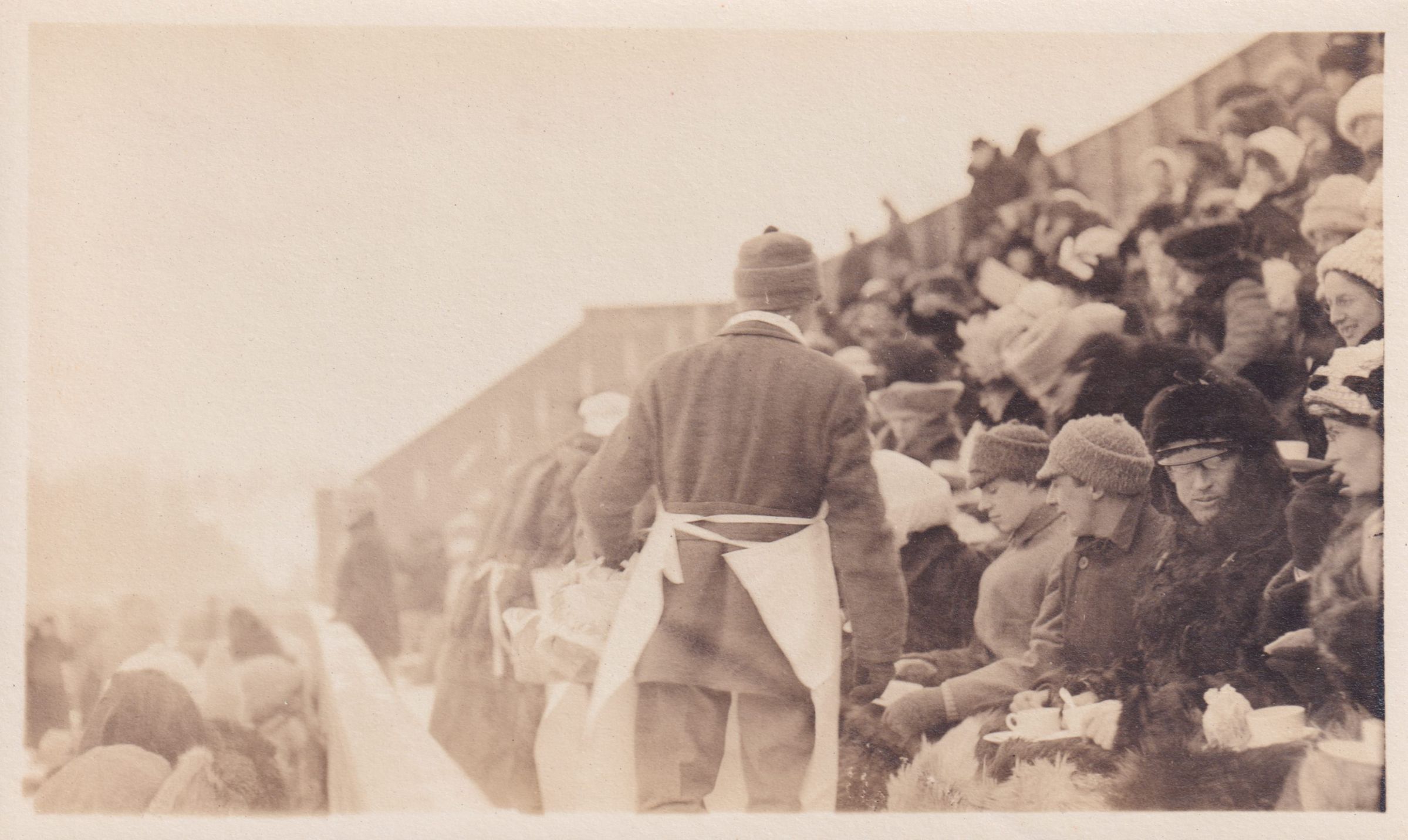 Photograph of spectators sitting in the stands at Pontiac Bay. Two vendors wearing aprons are standing in front of the crowd with baskets.
