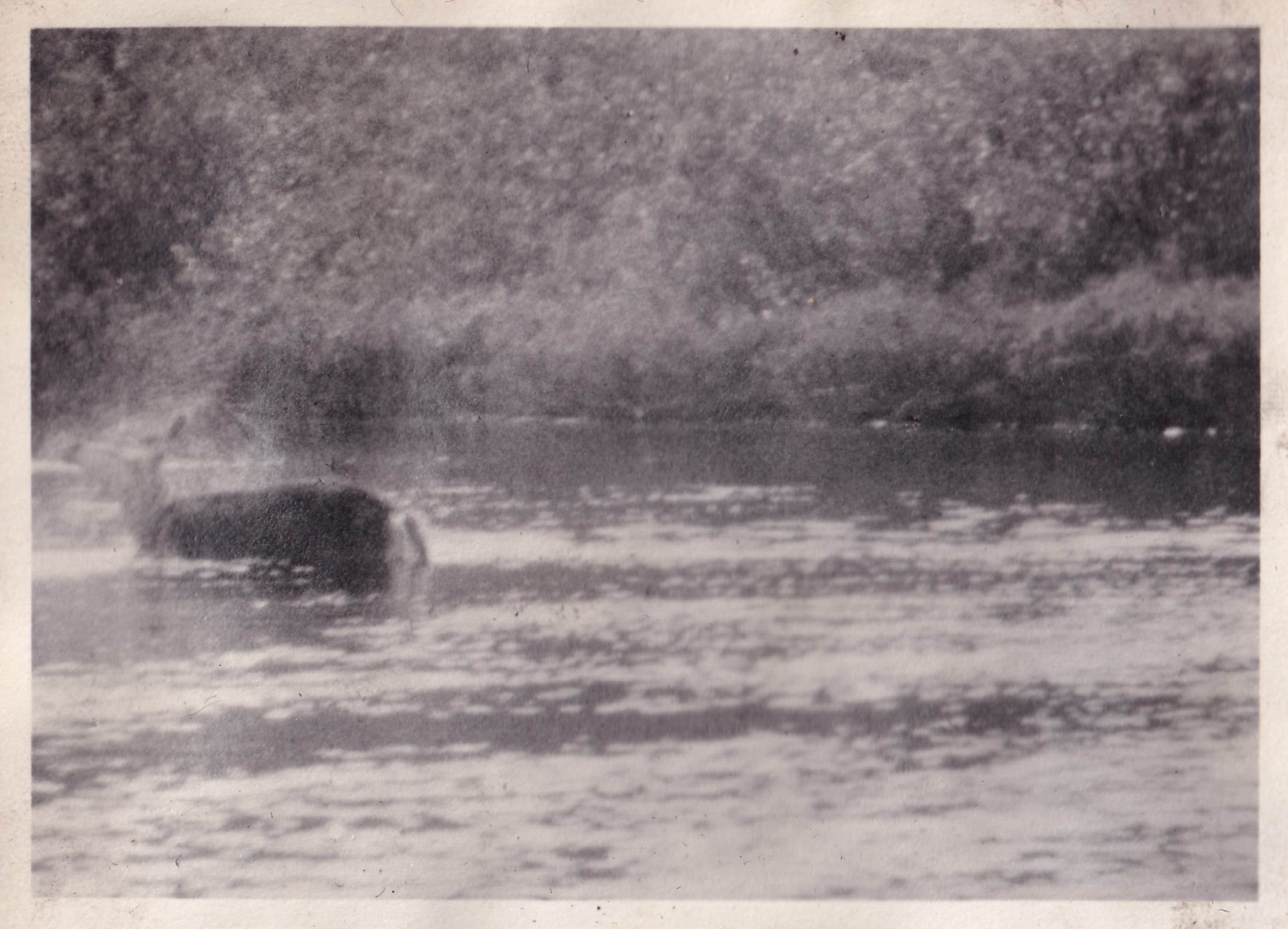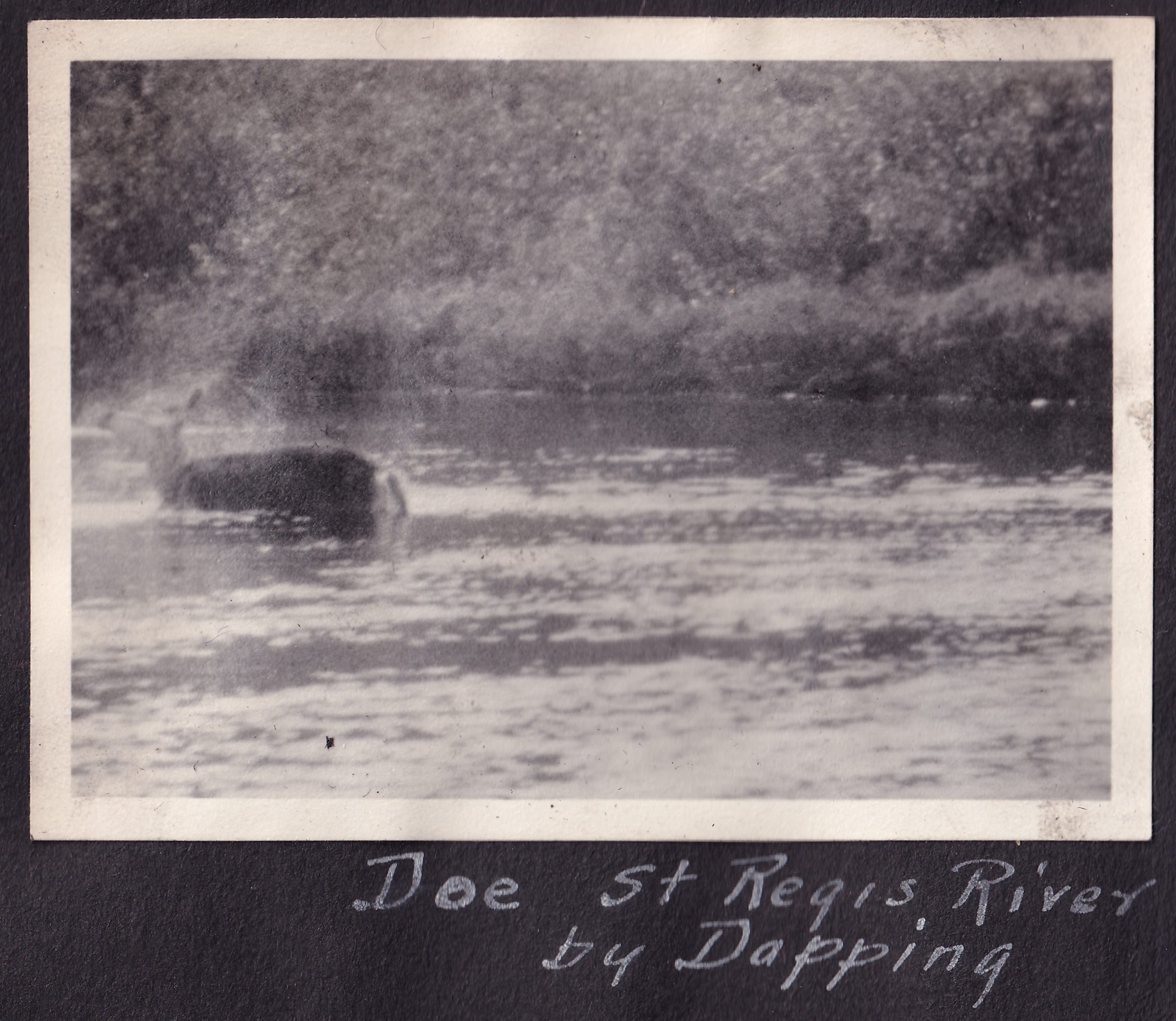 Black-and-White photograph of a deer wading in a river. Handwritten caption on page reads, "Doe St. Regis River by Dapping."