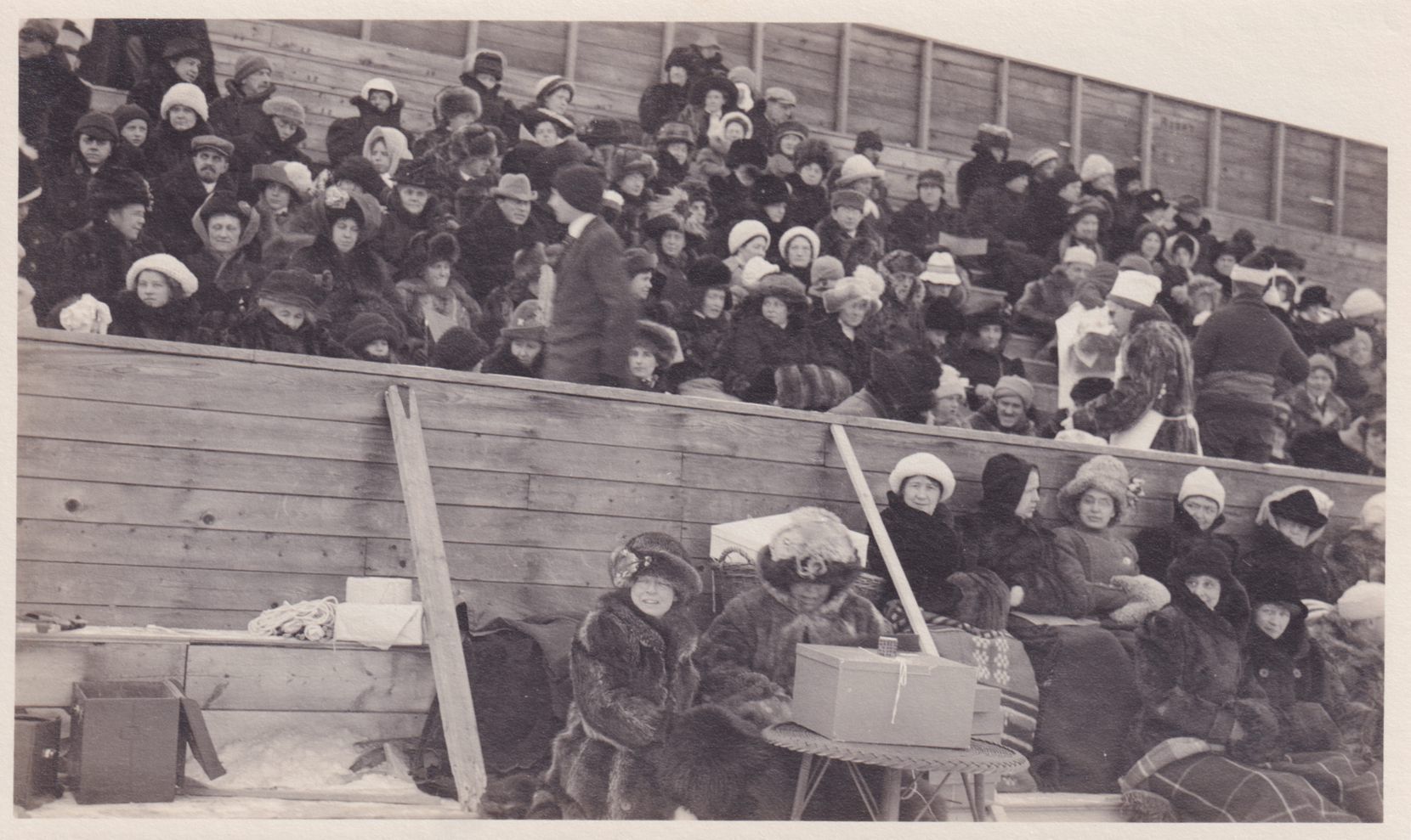 Photograph of spectators sitting in the stands at Pontiac Bay. A vendor in an apron can be seen in front of the spectators.