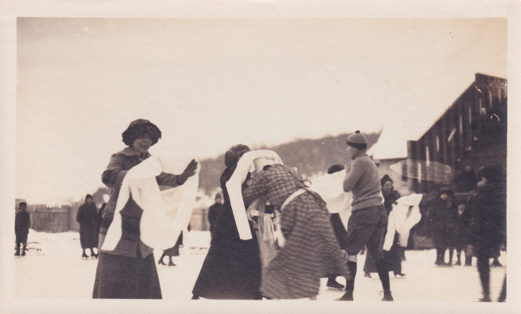 Photograph of a group of people on the ice on Pontiac Bay on Lake Flower. They appear to be putting on white shirts or dresses.