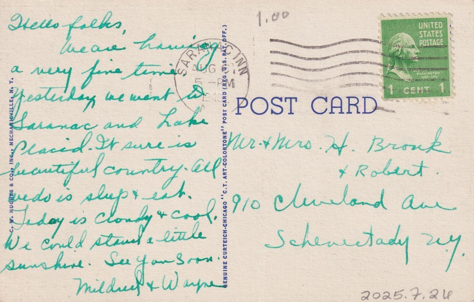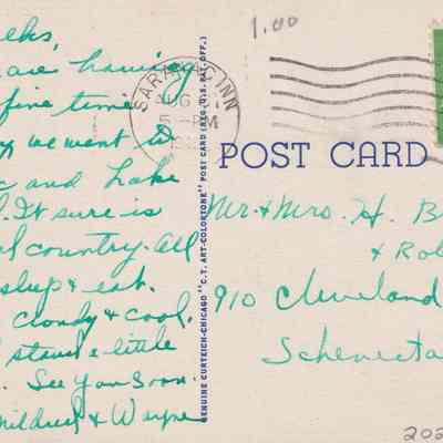 Handwritten message on reverse reads, "Dear folks, We are having a very fine time. Yesterday we went to Saranac and Lake Placid. It sure is beautiful country. All we do is sleep & eat. Today is cloudy and cool. We could stand a little sunshine. See you soon. Mildred & Wayne." Mailed to Mr. & Mrs. H. Bronk + Robert, 910 Cleveland Ave., Schenectady, NY.Subject Place
