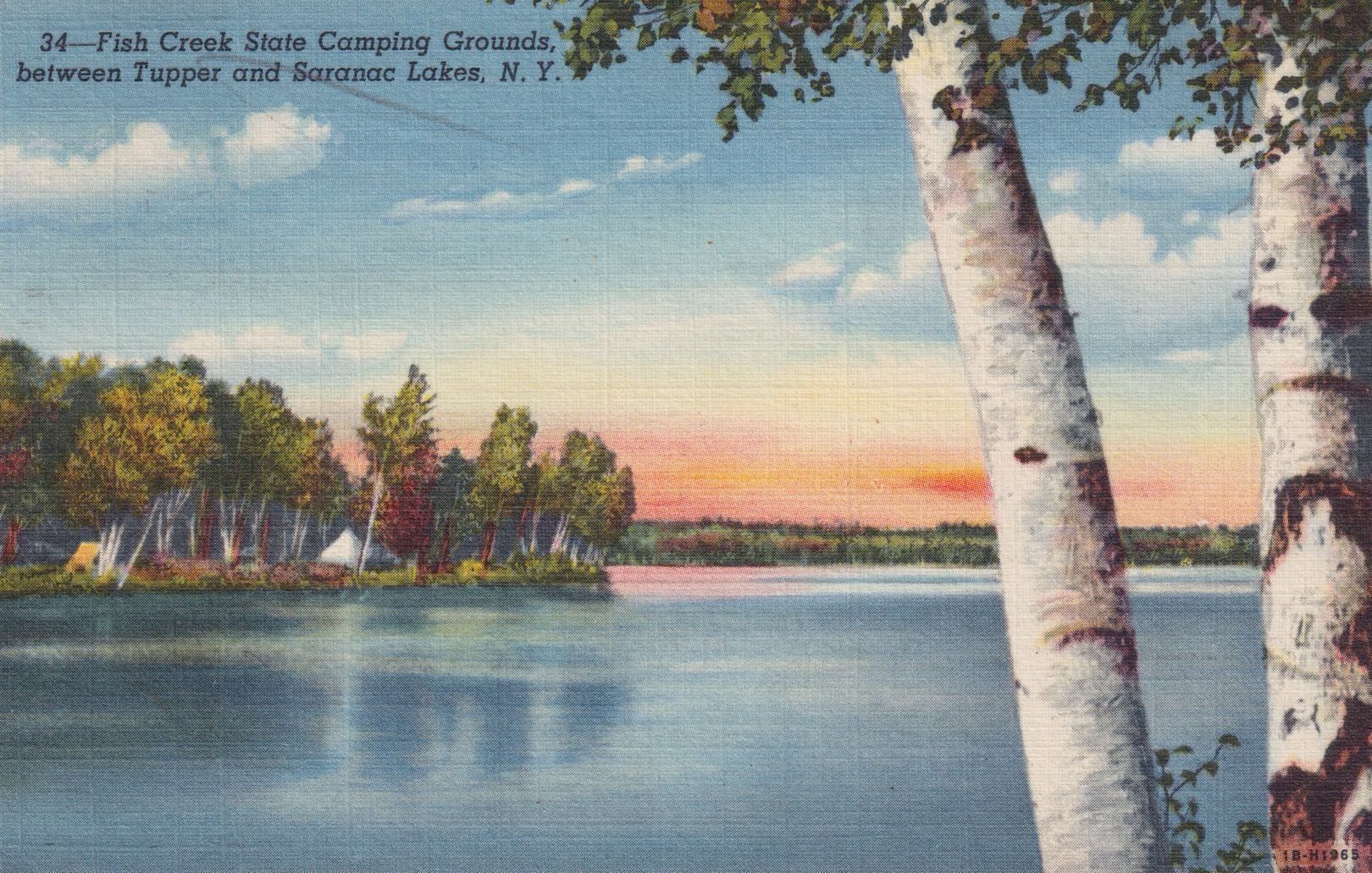 Color linen postcard showing a view of campsites across a body of water. Printed caption on front reads, "Fish Creek State Camping Grounds, between Tupper and Saranac Lakes, N. Y." Printed by C. W. Hughes & Co., Mechanicville, NY. Used, divided back, postmarked Saranac Inn, August 6, 1948.