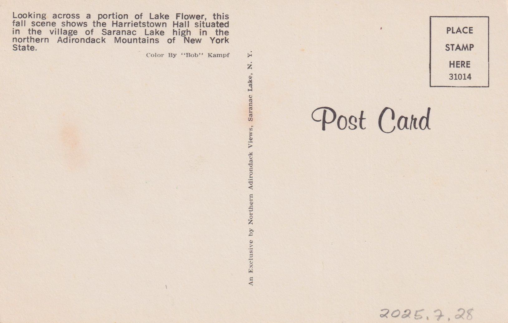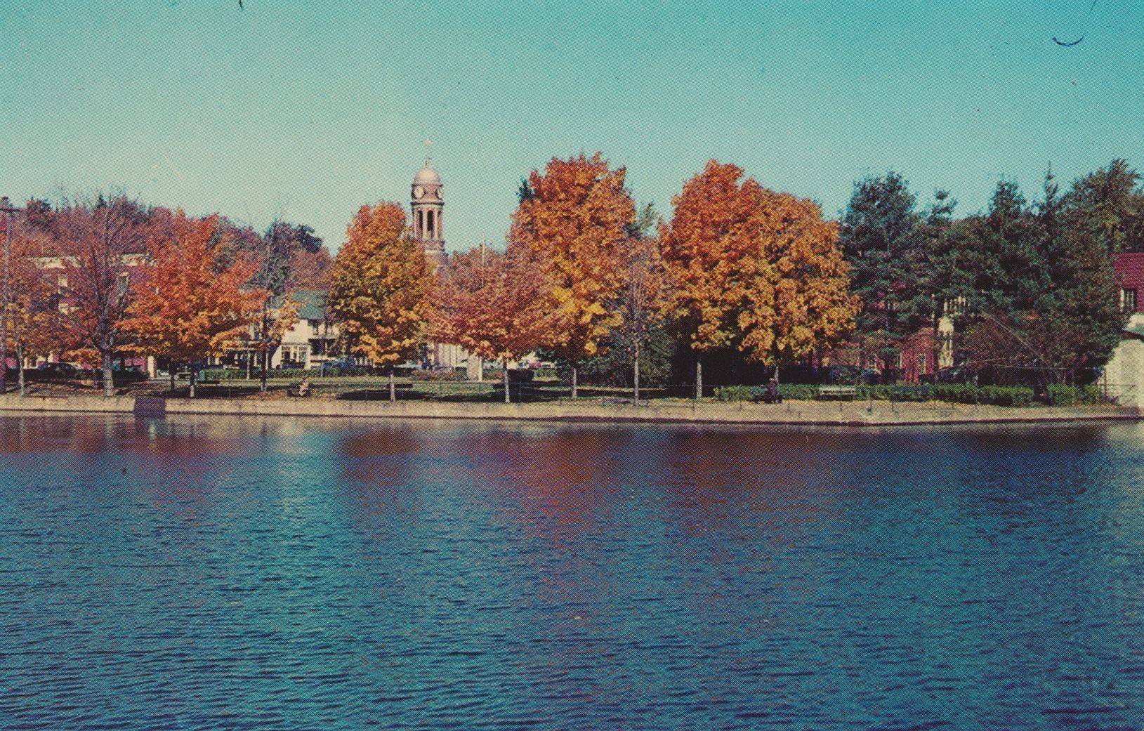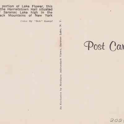 Color postcard showing a view across Lake Flower in the fall. The tower of Harrietstown Town Hall is just visible over the trees. Printed caption on reverse reads, "Looking across a portion of Lake Flower, this fall scene shows the Harrietstown Town Hall situated in the village of Saranac Lake high in the northern Adirondack Mountains of New York State." Printed by Northern Adirondack Views, Saranac Lake, NY. Unused, divided back.Subject Place