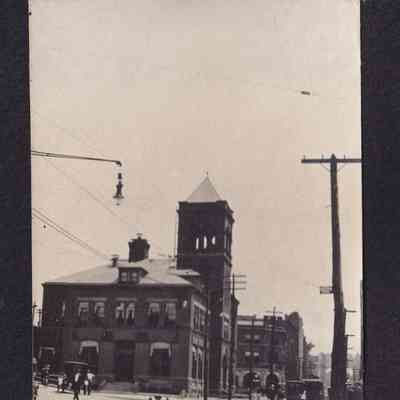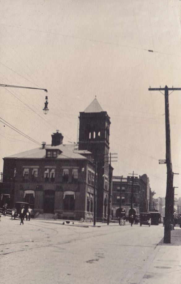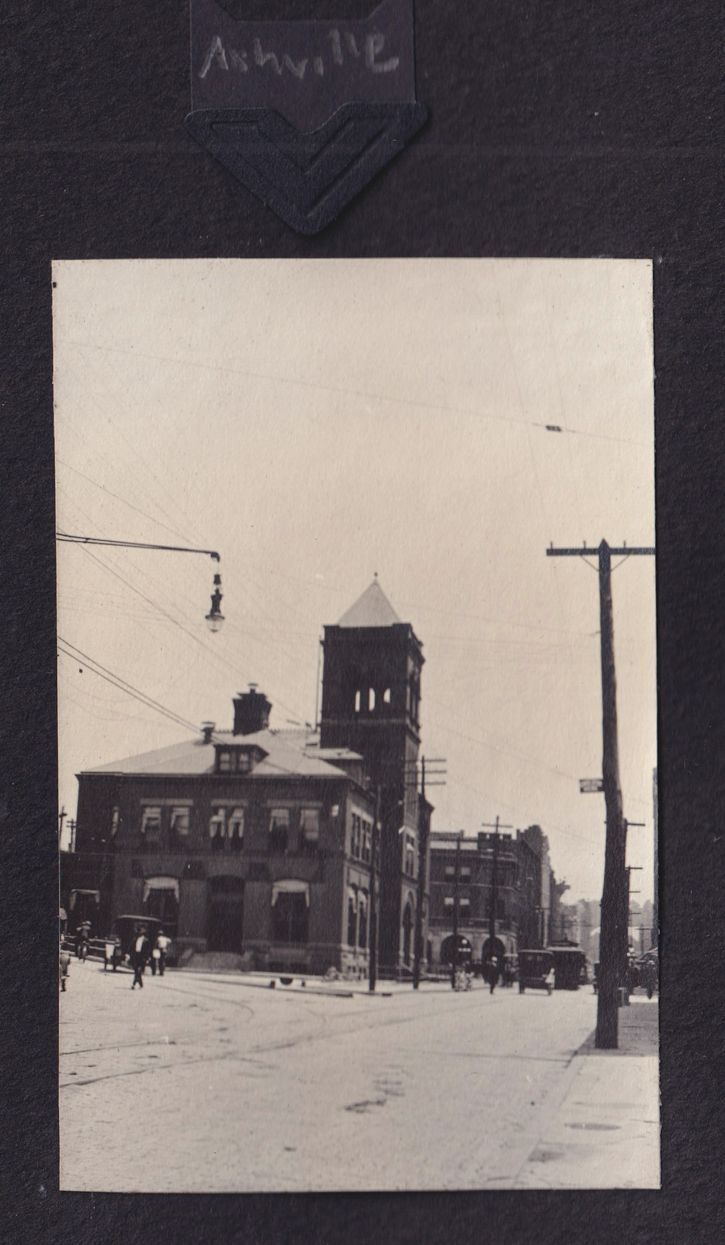 Black-and-white photograph of a square building with a tower in Asheville, North Carolina, built on the corner of two roads. There are cars and people on the streets and sidewalks. "Ashville" is written in white ink above the photograph.