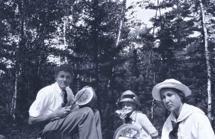 Negative of three people sitting in the woods with watermelon. Henry Ives Baldwin is on the left holding half of a watermelon and a knife. Most likely taken by Mary Ives Baldwin. This item is not fully cataloged but has been uploaded so the image is publicly available; if you would like us to prioritize cataloging this item, please contact the HSL Collections team.