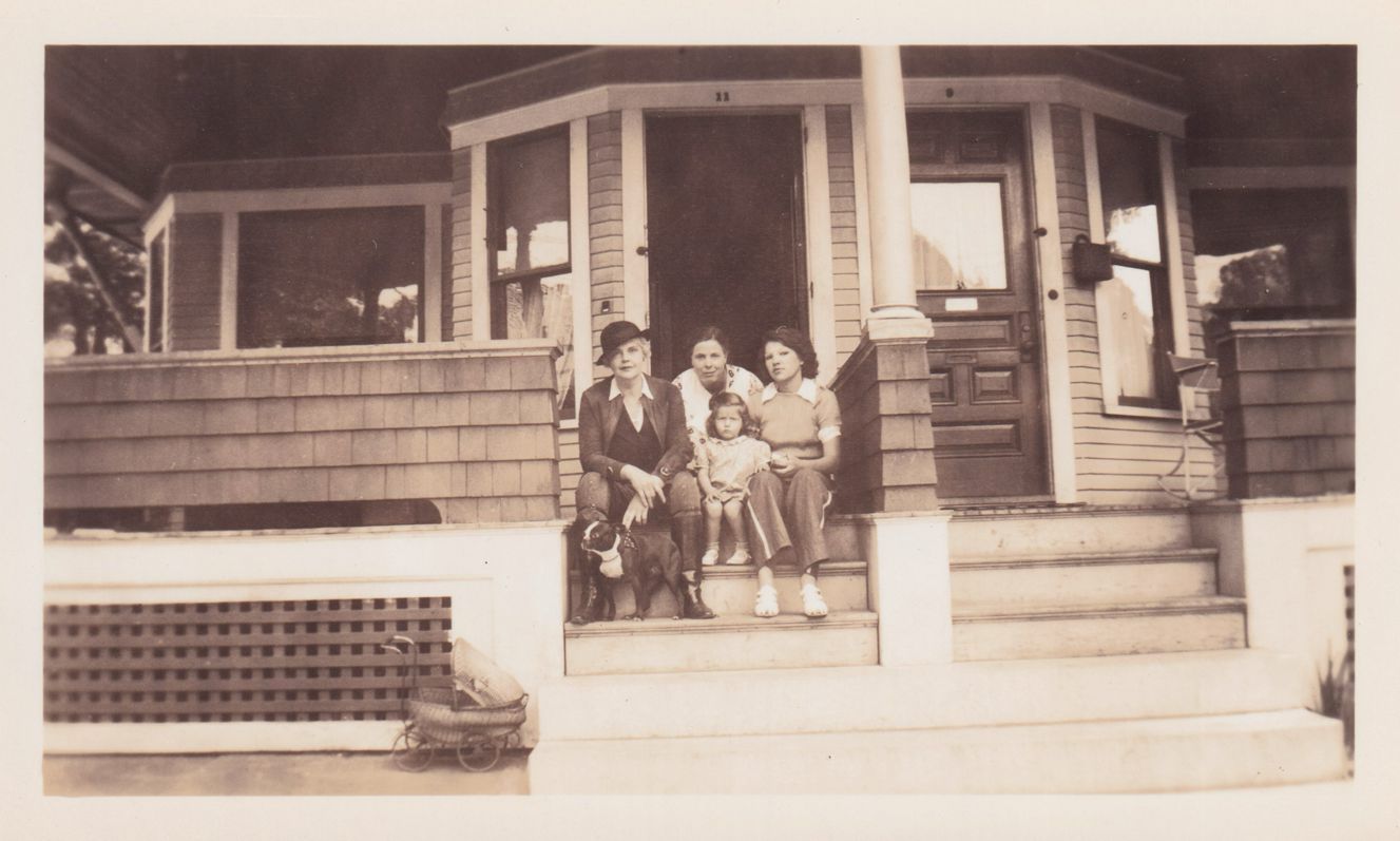 Black-and-White photograph three women and a young girl seated on the front steps of a duplex cure cottage. There is a dog on the steps with them. Was in an envelope marked, "Hoffman, Monday Jul 12 1937." Photograph was developed by Kollecker's Kodak and Gift Shop. Negative is 2024.2.36.12.