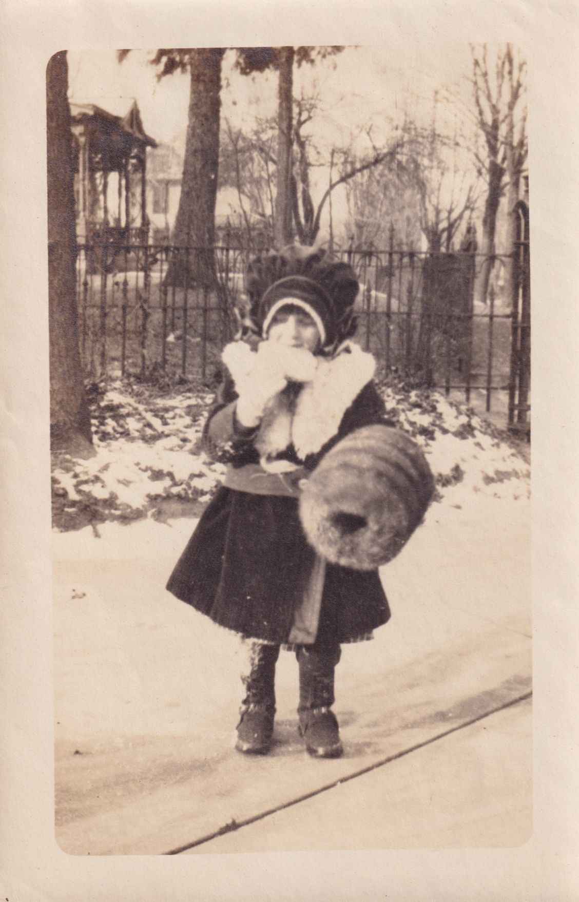 Photograph of a child in winter gear holding a fur muff. Likely one of the Durbin children.